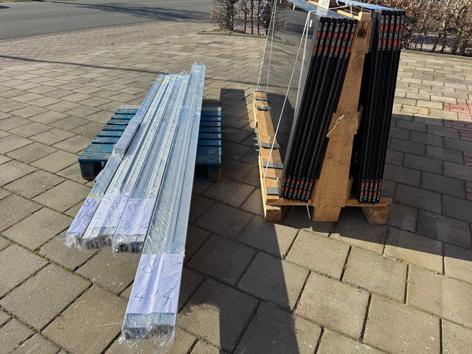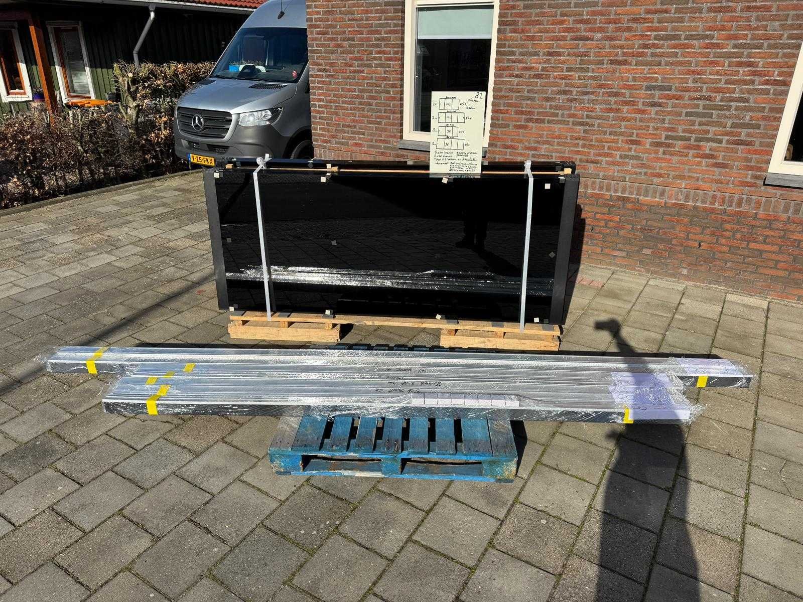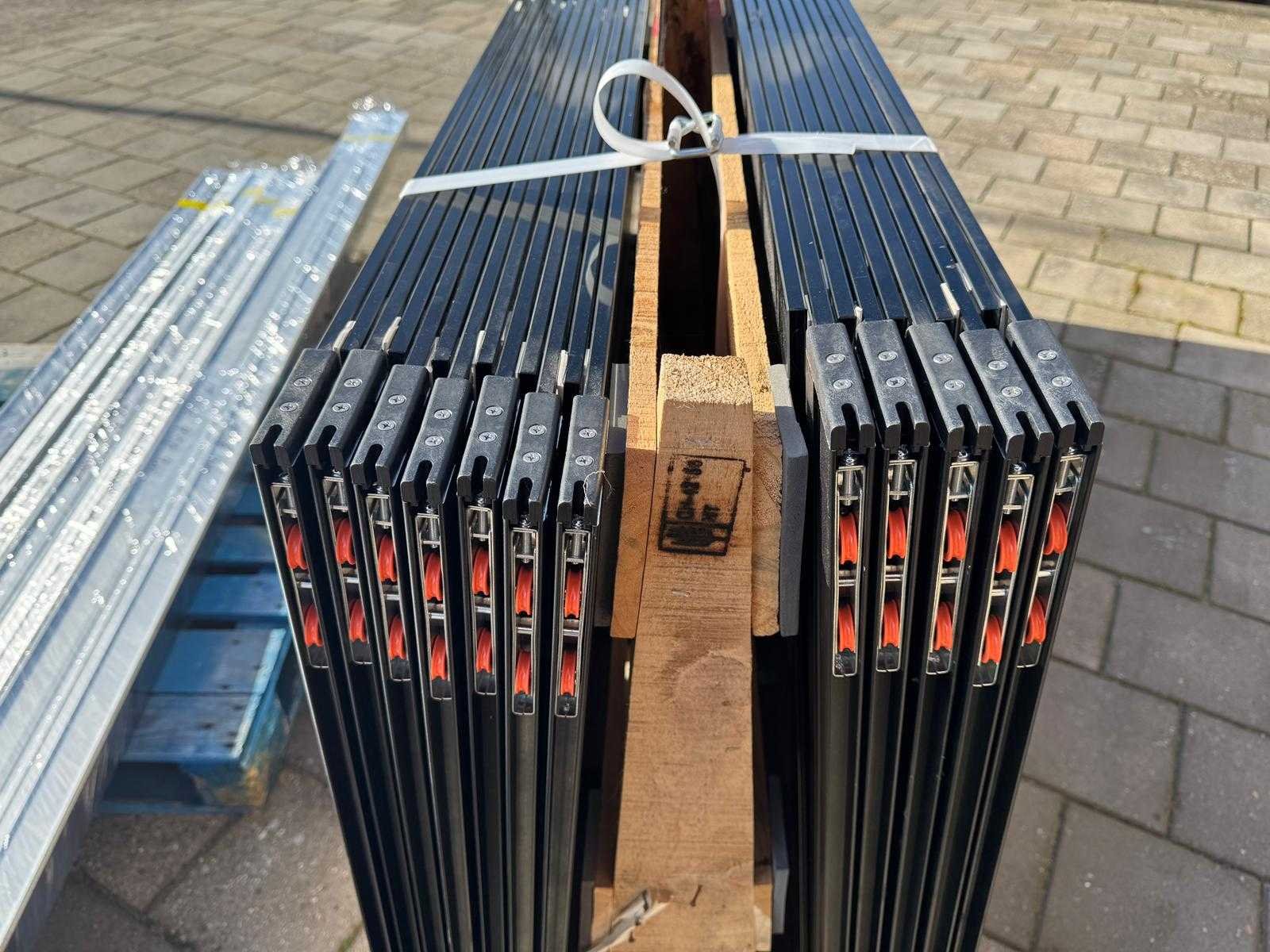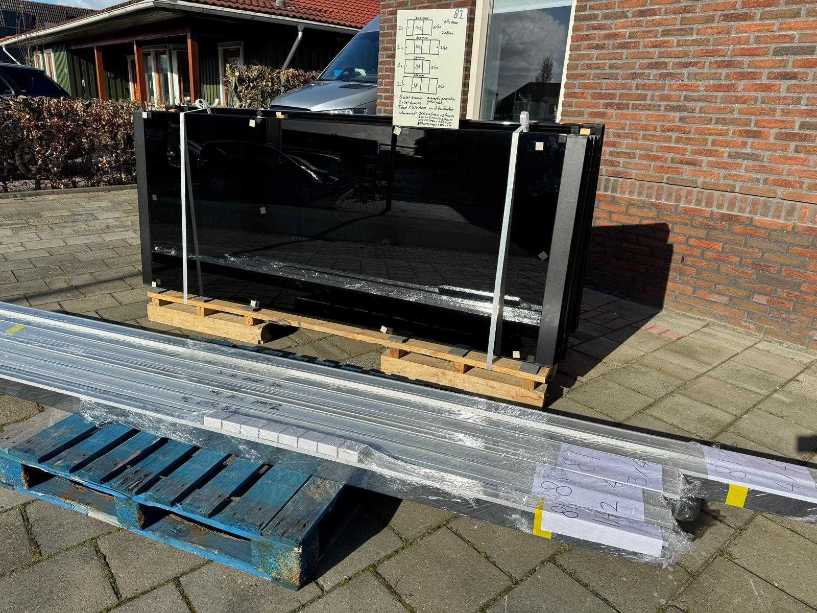 5 sets van 3 & 2 sets van 4 schuiframen – 98 & 102 cm x 240 cm, getint glas • Afmetingen per raam: breedte 98 & 102 cm, hoogte (dagmaat) 240 cm • Maximale breedte complete set: 290, 300, 386 & 400 cm • Totaal: 23 ramen (5 sets van 3 stuks & 2 sets van 4 stuks) • Materiaal & kleur: zwart aluminium frame, getint glas • Inclusief: 5 boven- en 5 onder-rails met 3 sporen & 2 boven- en 2 onder-rails met 4 sporen • 8 handgrepen • Conditie: partijhandel – kan lichte strepen of vegen bevatten • Verpakking: op pallet met glas • Opmerking: foto van overkapping is ter illustratie • Heftruck is aanwezig voor het afhalen Nee