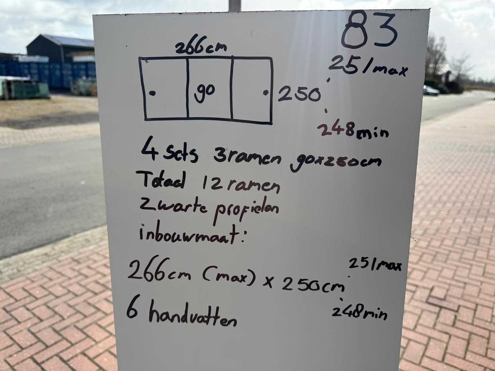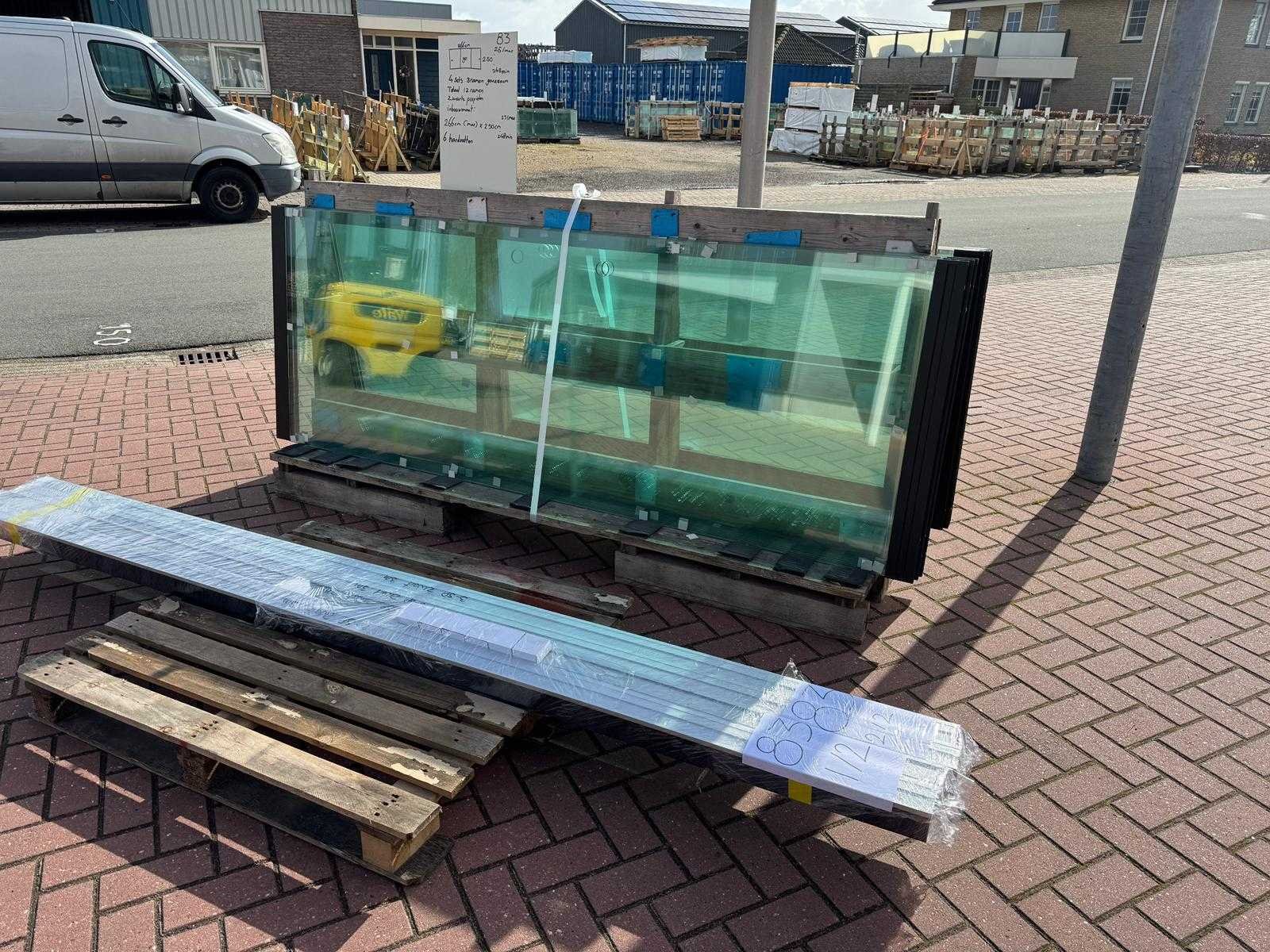 4 sets van 3 schuiframen 90 cm x 250 cm, helder glas • Afmetingen per raam: breedte 90 cm, hoogte (dagmaat) 250 cm • Maximale breedte complete set: 266cm • Totaal: 12 ramen (4 sets van 3 stuks) • Materiaal & kleur: zwart aluminium frame, helder glas • Inclusief: 4 boven- en 4 onder-rails met 3 sporen • 6 handgrepen • Conditie: partijhandel – kan lichte strepen of vegen bevatten • Verpakking: op pallet met glas • Opmerking: foto van overkapping is ter illustratie • Heftruck is aanwezig voor het afhalen Nee