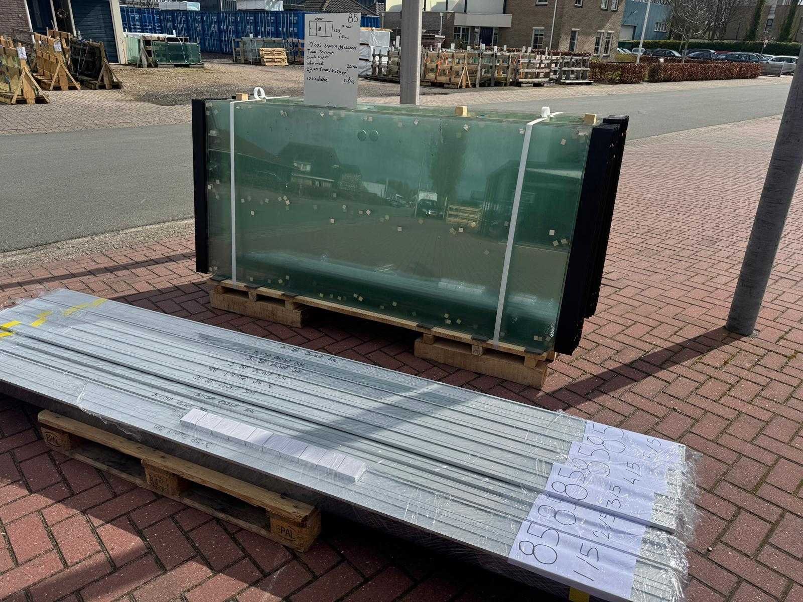 10 sets van 3 schuiframen – 98 cm x 220 cm, helder glas • Afmetingen per raam: breedte 98 cm, hoogte (dagmaat) 220 cm • Maximale breedte complete set: 290 cm • Totaal: 30 ramen (10 sets van 3 stuks) • Materiaal & kleur: zwart aluminium frame, helder glas • Inclusief: 10 boven- en 10 onder-rails met 3 sporen • 10 handgrepen • Conditie: partijhandel – kan lichte strepen of vegen bevatten • Verpakking: op pallet met glas • Opmerking: foto van overkapping is ter illustratie • Heftruck is aanwezig voor het afhalen Nee