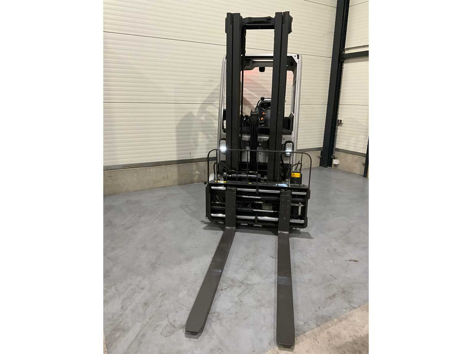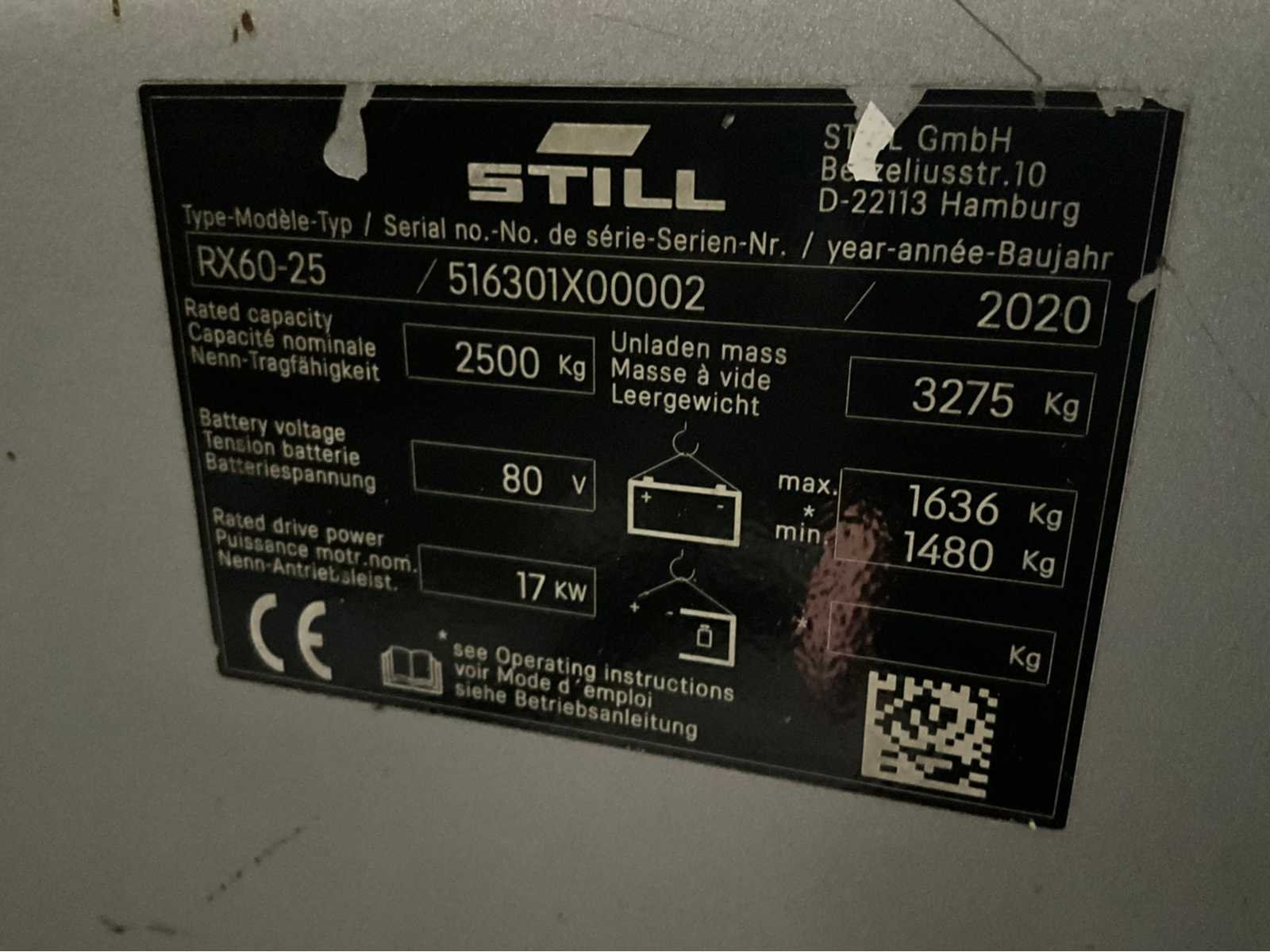 Extra opties : Led verlichting voor en achter , Blue spot , Lepelversteller , elektrische handrem , Nee Merk: Still Type: RX60-25 Bouwjaar: 2020 Serienummer: 516301X00002 Brandstof: Elektrisch Mast: Triple Soort band: Volrubber banden Aantal wielen: 4 Afgelezen urenstand: 6333 Free-lift: true Hydraulisch verstelbare lepels: true Triple mast: true Eigen gewicht: 4911kg Hefvermogen: 2500kg Lepellengte: 1600mm Hefhoogte: 5390mm Vol rubber banden: true Totale afmeting L: 4060mm Totale afmeting Breedte: 1200mm Totale afmeting Hoogte: 2460mm