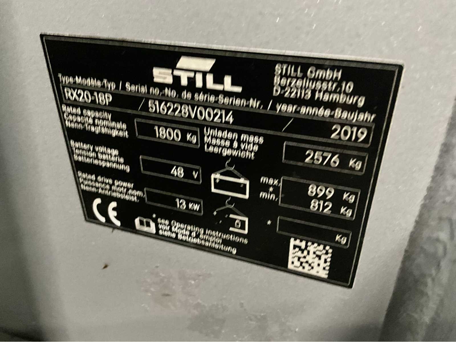 Extra opties : Led verlichting voor en achter , blue spot , Non-marking banden , zwaailamp , valbescherming Nee Merk: Still Type: RX20-18P Bouwjaar: 2019 Serienummer: 516228V00214 Mast: Triple Soort band: Volrubber banden Aantal wielen: 4 Free-lift: true Side-shift: true Triple mast: true Eigen gewicht: 3475kg Hefvermogen: 1800kg Hefhoogte: 4220mm Vol rubber banden: true Totale afmeting L: 3170mm Totale afmeting Breedte: 1090mm Totale afmeting Hoogte: 1980mm