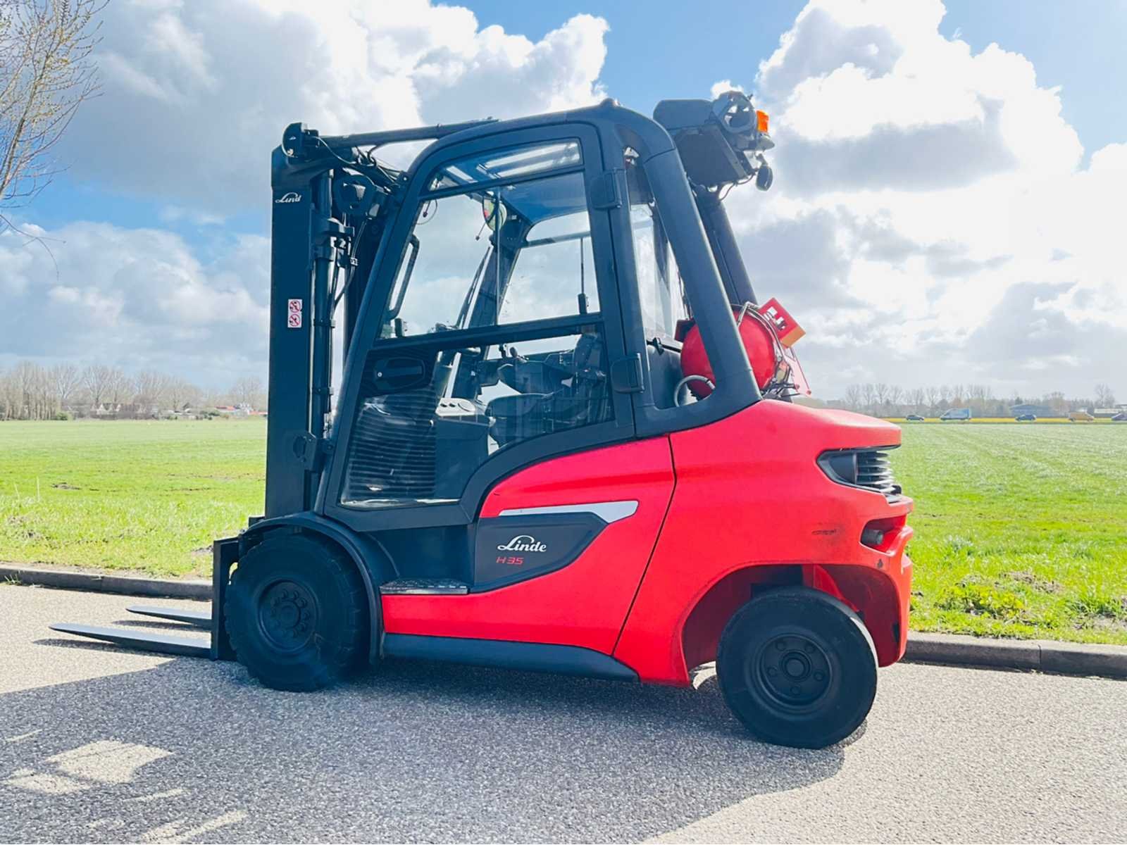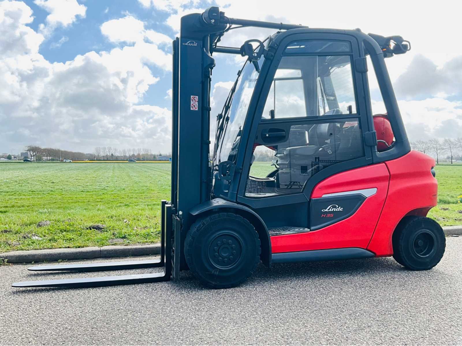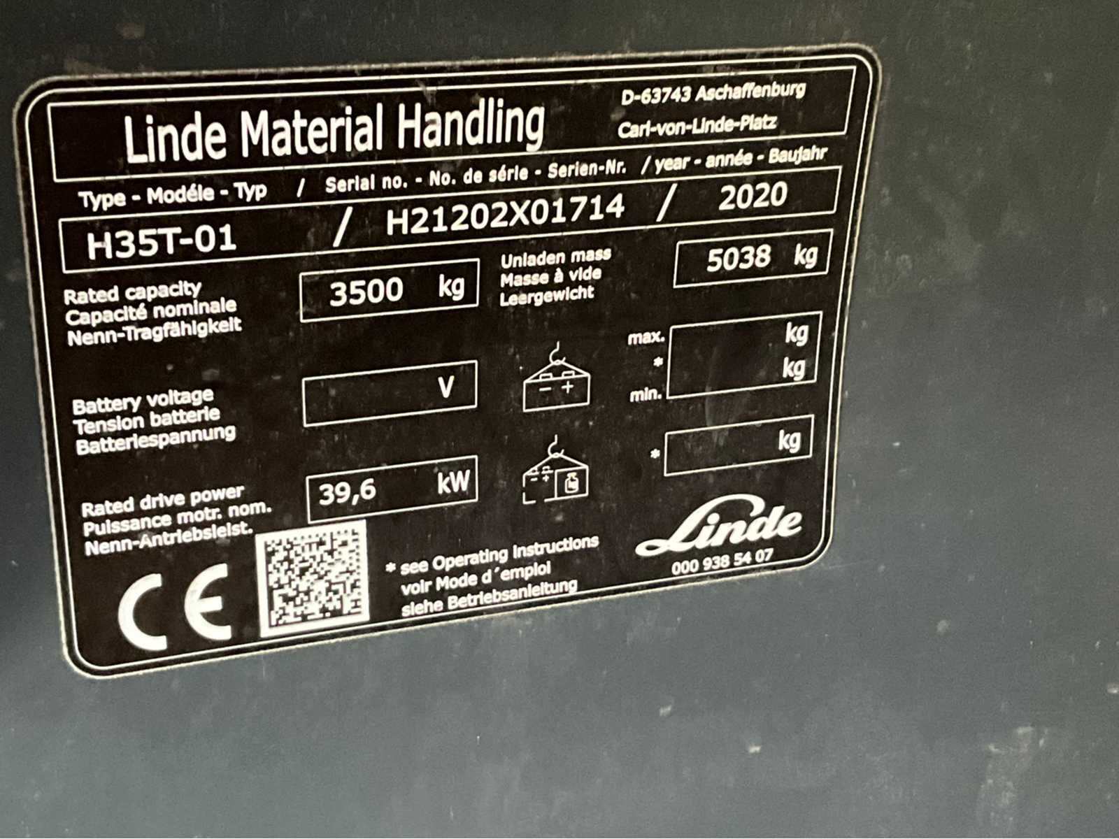 Extra opties : Recent gebouwde type , Rondom led verlichting , Volledige dichte cabine , Motor loopt prachtig , Dagrijverlichting , Blue spot , Verwarming, Airco , 3-5 funties , Zwaailicht , incl gastank , joy stick Nee Merk: Linde Type: H35T-01 Bouwjaar: 2020 Serienummer: H21202X01714 Brandstof: LPG Soort band: Volrubber banden Aantal wielen: 4 Eigen gewicht: 5038kg Hefvermogen: 3500kg Lepellengte: 1200mm Hefhoogte: 3390mm Vol rubber banden: true Totale afmeting L: 3980mm Totale afmeting Breedte: 1220mm Totale afmeting Hoogte: 2310mm