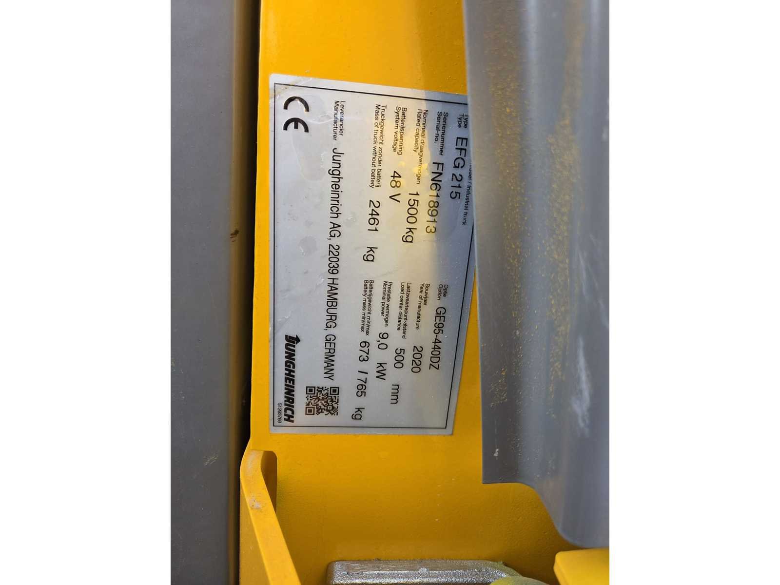 Extra opties : Rondom led verlichting , Blue spot , lepelversteller , joy stick , Non-marking banden , Zwaailamp , Nee Merk: Jungheinrich Type: EFG 215 Bouwjaar: 2020 Serienummer: FN618913 Mast: Triple Soort band: Volrubber banden Aantal wielen: 3 Afgelezen urenstand: 4427 Free-lift: true Side-shift: true Triple mast: true Eigen gewicht: 3226kg Hefvermogen: 1500kg Hefhoogte: 4300mm Vol rubber banden: true Totale afmeting L: 1800mm Totale afmeting Breedte: 1000mm Totale afmeting Hoogte: 2080mm