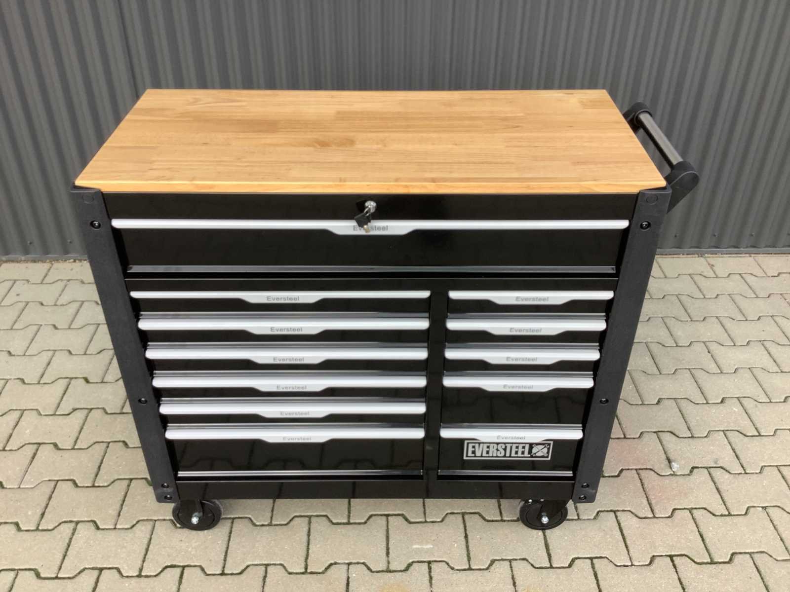 Voorzien van 12 laden; 10 laden gevuld met diverse gereedschappen en accessoires, lades en wielen voorzien van kogellagers, houten bovenblad (voor gebruik als werkbank), circa 1 meter werkhoogte; ongebruikt in doos No Merk: Eversteel Type: Jumbo XXXL 12/10 Professional Gewicht: 122kg Lengte: 108cm Breedte: 105cm Hoogte: 100cm Materiaal: Metaal & hout