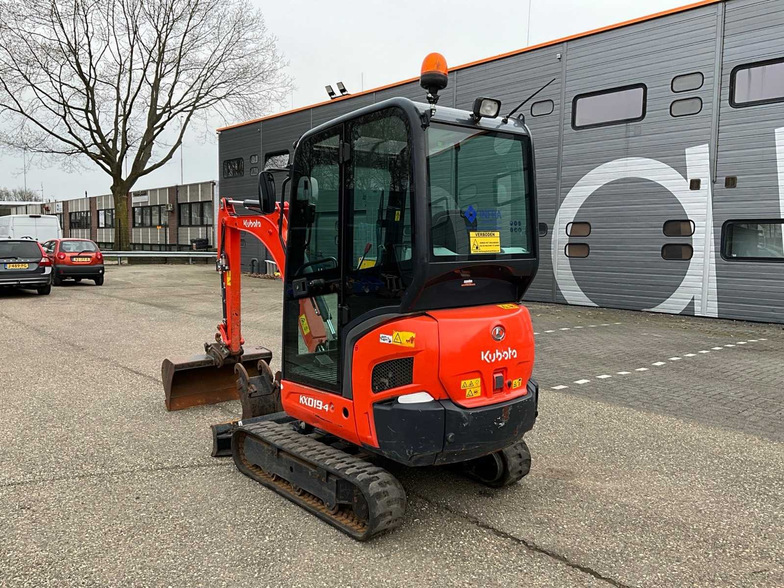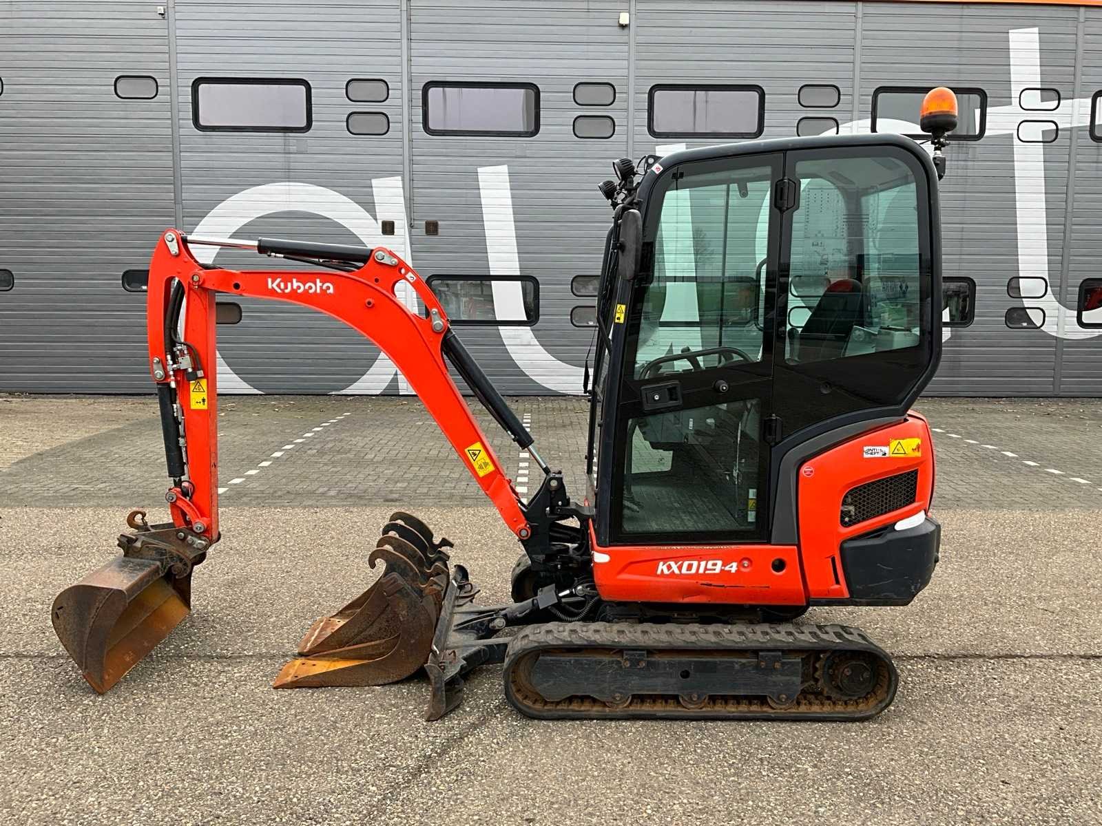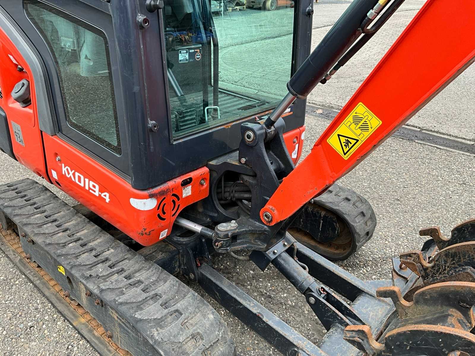 CW05 hydraulische snelwissel, CW05 slotenbak 100cm, CW05 dieplepel 40cm, CW05 banaanbak 24cm, 3e functie voorbereid, verstelbaar rijwerk 99cm t/m 130cm, 2e rijsnelheid, radio, LED lichtbalk voor, kubota anti theft inclusief rode sleutel Nee Merk: Kubota Type: KX019-4 Bouwjaar: 2022 Serienummer: KBCGF22BLNZC76501 Merk motor: Kubota Motorvermogen (kW): 11.6kW Aantal cilinders: 3 Brandstof: Diesel Bedrijfsgewicht: 1855kg Rups breedte: 230mm Afgelezen urenstand: 1772