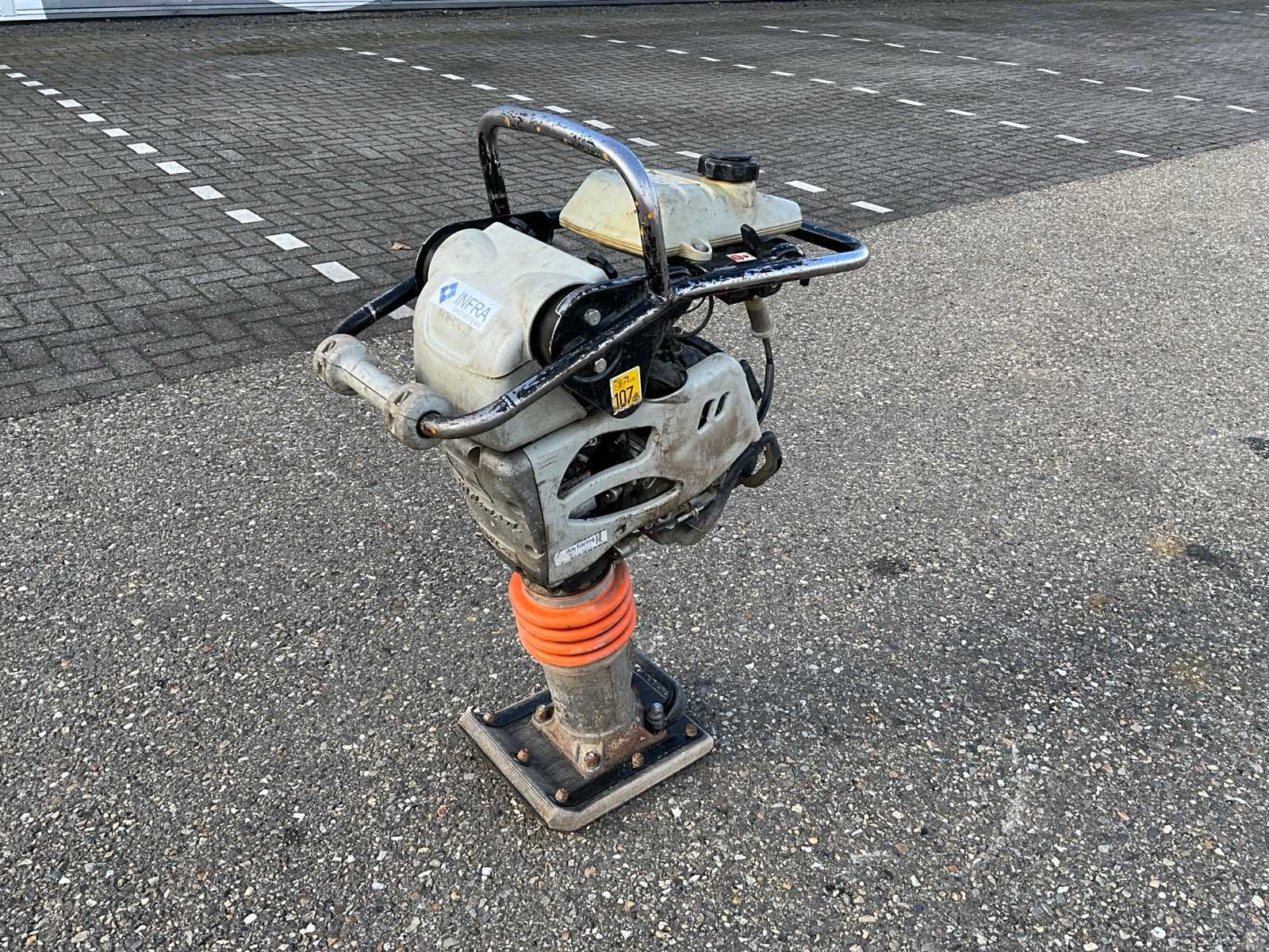 568 uur Nee Merk: Mikasa Type: MTX60-E Bouwjaar: 2015 Serienummer: Z6112 Bedrijfsgewicht: 64kg Afmeting voet l: 330mm Afmeting voet b: 260mm Merk motor: Honda Motorvermogen (kW): 2kW Brandstof: Benzine