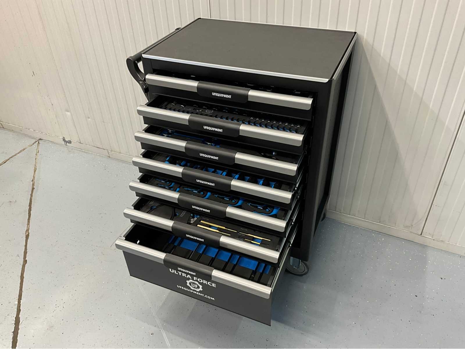 Professionele gereedschapswagen, 7 laden gevuld met 266 pcs gereedschap. 2 sleutels. Nee Merk: Ultra Force Equipment Kleur: . Gewicht: 72kg Lengte: 70cm Breedte: 48cm Hoogte: 101cm
