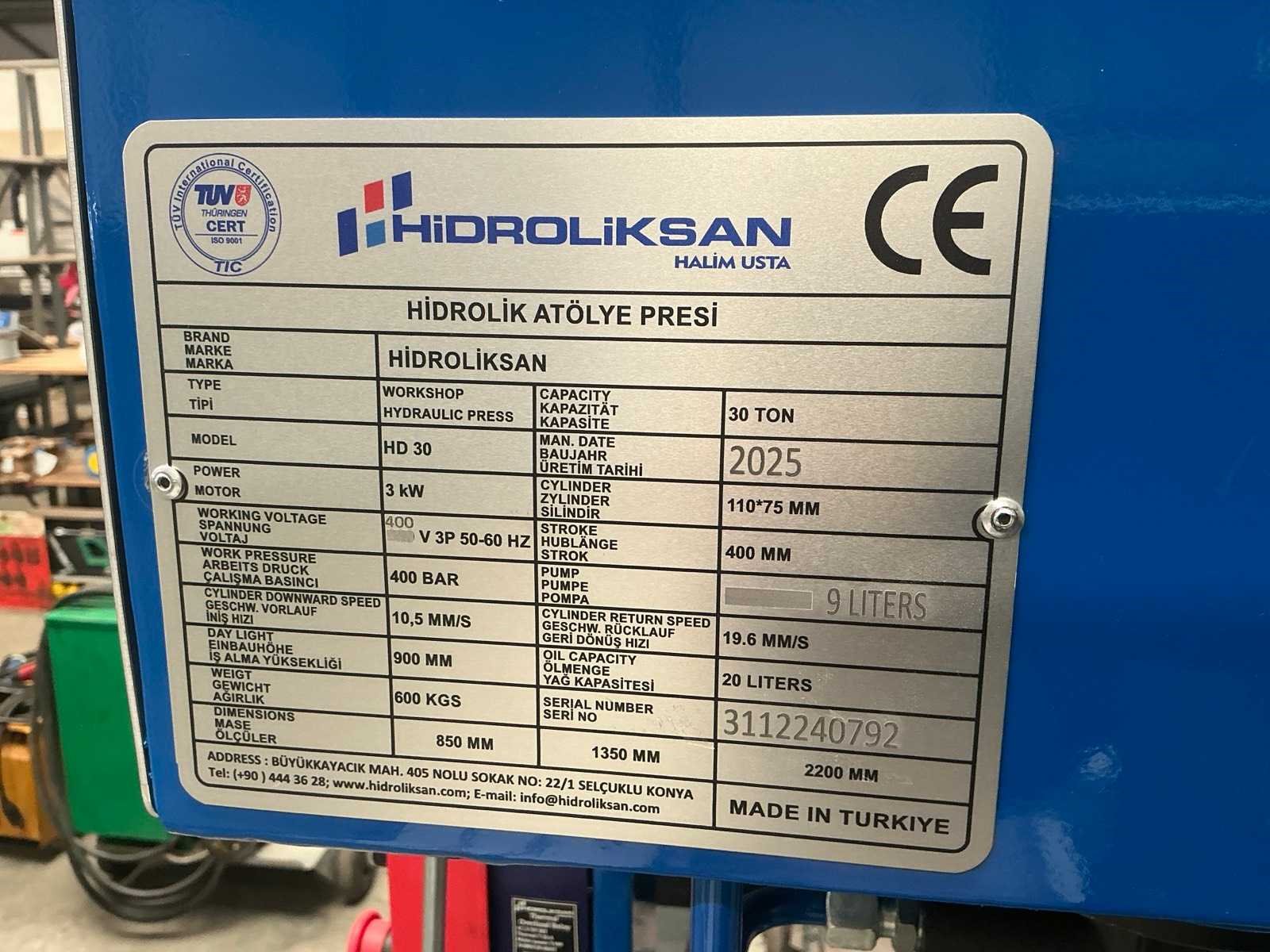 Ongebruikte machine, voorzien van verstelbare werkcilinder, handbediend/elektrisch, 3kW motor, hoogte verstelbare tafel Nee Merk: Hidroliksan Type: HD30 Bouwjaar: 2025 Serienummer: 3112240792 Capaciteit.: 30t 2-koloms: true Afstand tussen de kolommen: 735mm Elektro-hydraulisch: true Slaglengte: 400mm Aansluiting: 400V Totale afmeting L: 1380mm Totale afmeting Breedte: 850mm Totale afmeting Hoogte: 2300mm
