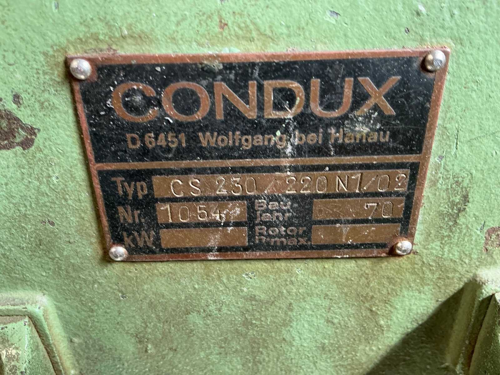 Nee Merk: Condux Type: CS230/220N1/02 Bouwjaar: 1970 Serienummer: 154 Motorvermogen (kW): 3kW Aansluiting: 400V Totale afmeting L: 900mm Totale afmeting Breedte: 630mm Totale afmeting Hoogte: 1550mm