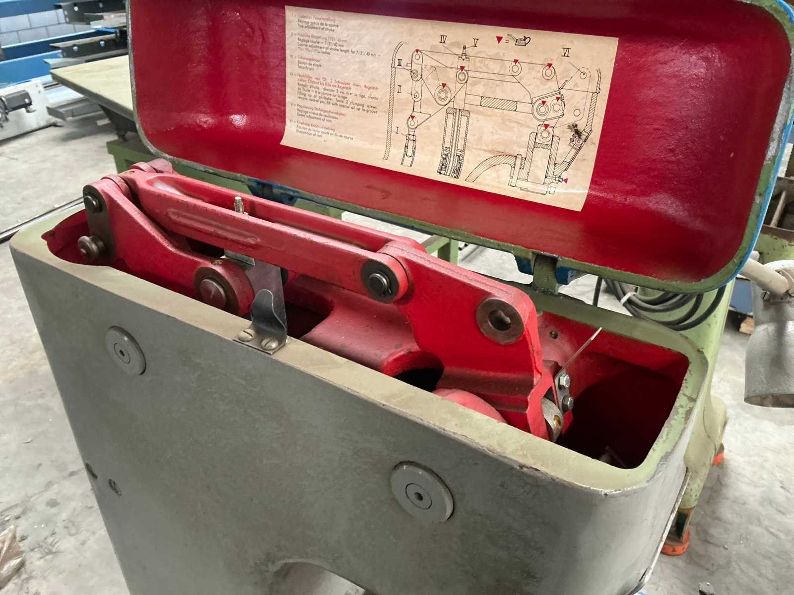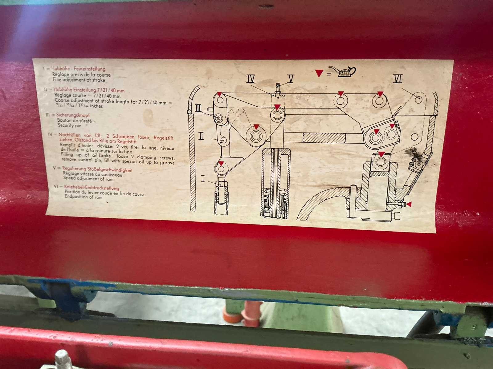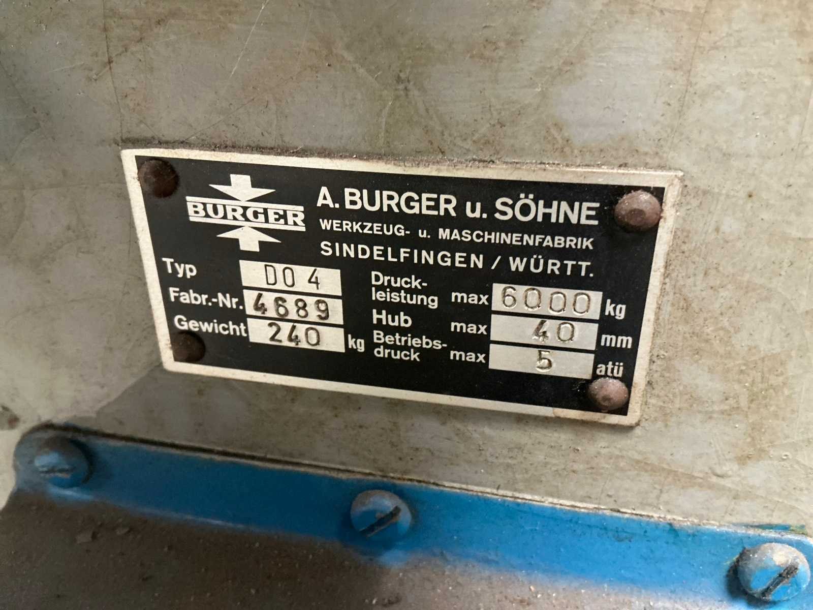 Hoogte verstelbare tafel Nee Merk: Burger Type: DO 4 Serienummer: 4589 Capaciteit.: 6t Uitlading: 130mm Slag: 40mm Tafel afmeting l: 340mm Tafel afmeting b: 270mm Machinegewicht: 240kg Afmeting l: 700mm Afmeting b: 450mm Afmeting h: 1370mm