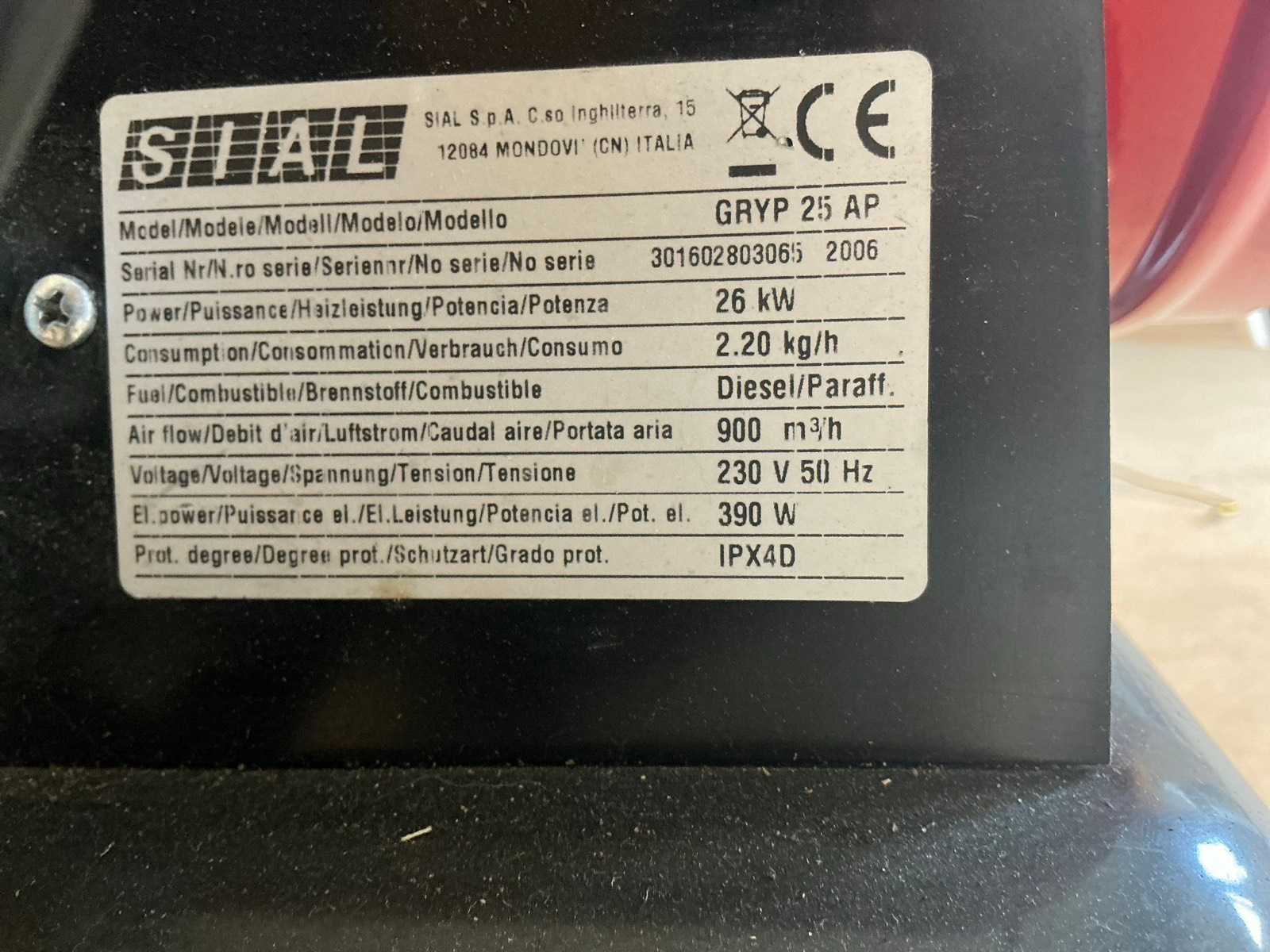 Dieselgestookte jetheater, voorzien van rookgas afvoer aansluiting boven op de heater. Dus schone warmte naar binnen.inclusief circa 10 liter diesel in kunststof flacon Nee Merk: Sial Type: GRYP 25AP Bouwjaar: 2006 Serienummer: 301602803065 Vermogen: 26kW Ventilator: true Totale afmeting L: 1000mm Totale afmeting Breedte: 590mm Totale afmeting Hoogte: 780mm Aansluiting: 230V