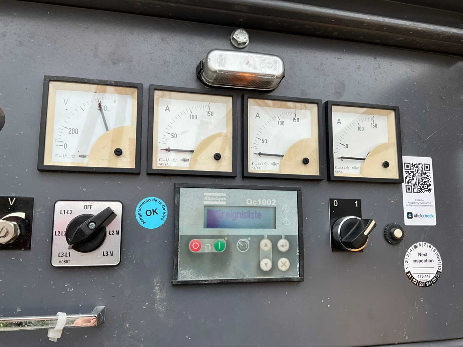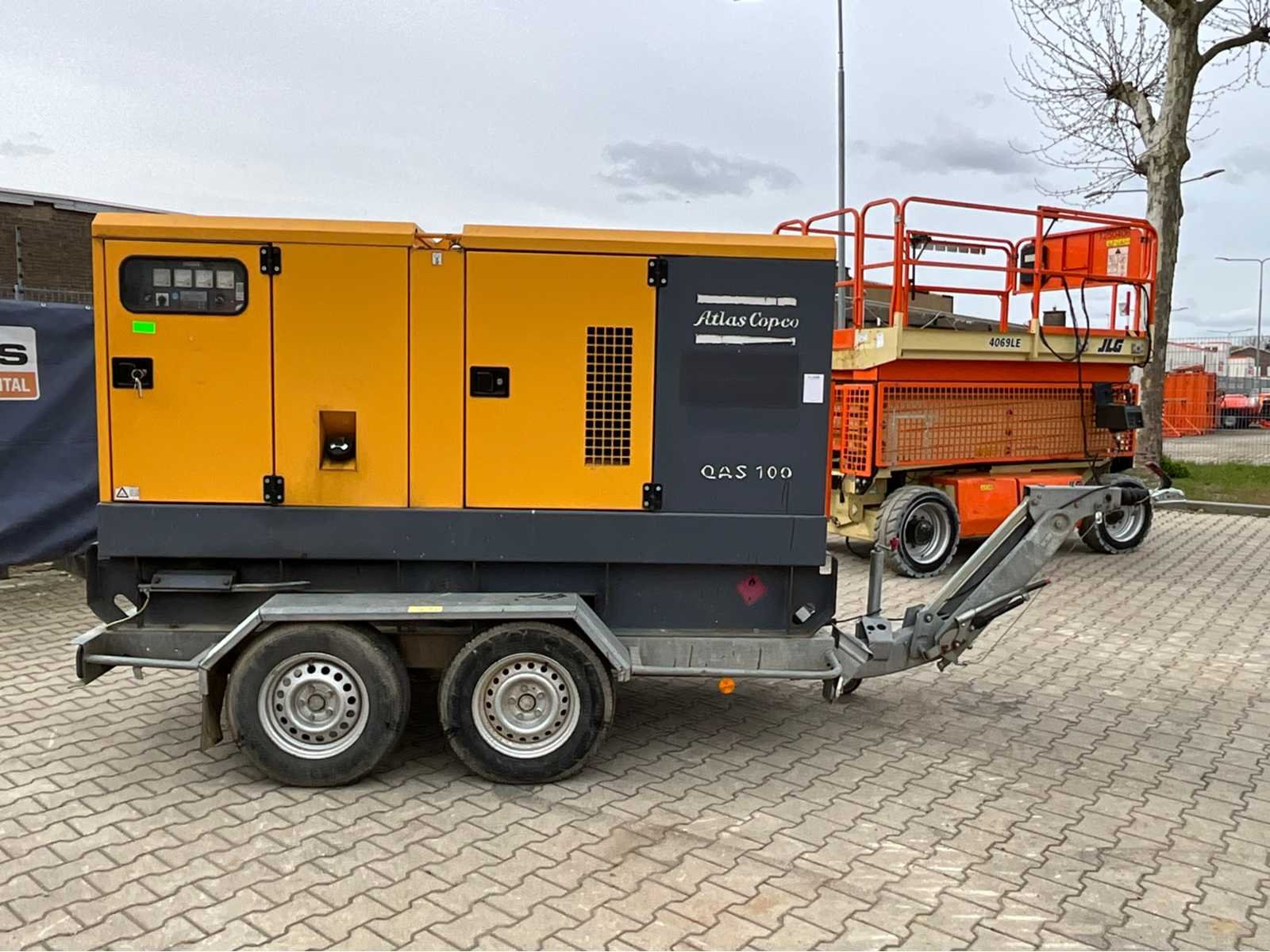 Geluidgedempt; aansluiting: 1x 400 Volt - 16 Ampère; 1x 400 Volt - 32 Ampère; 2x 400 Volt - 63 Ampère; 1x 230 Volt; inhoud brandstoftank 590 liter; aansluiting externe brandstoftank; verbruik bij maximale belasting 24 liter / uur; heftruck sleuven; hijsoog; working condition; gemonteerd op gegalvaniseerd staal frame; (de koper dient bij transport over de weg zelf te voorzien in een geldig kenteken; een 13 polige aansluitstekker (verlengsnoer kan ter plaatse tegen betaling aangekocht worden); eventueel extra lichtbalk; Duitse kentekenpapieren; gelijkvormigheidsattest; (M-QV303) Nee Merk: Atlas Copco Type: QAS 100 Bouwjaar: 2010 Serienummer: ESF351592 Capaciteit.: 100kVA Motor merk: FPT 4 cilinder Motorcapaciteit: 80kW Generator merk: Leroy-Somer Afgelezen urenstand: 11566 Machinegewicht: 2500kg Totale afmeting L: 2850mm Totale afmeting Breedte: 1100mm Totale afmeting Hoogte: 1850mm