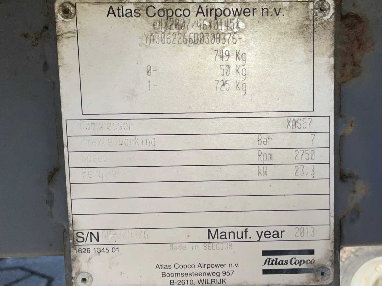 Chassisnummer YA306226600308376; Deutz 2 cilinder dieselmotor; staal kap; opklapbare trekboom; neussteun; (de koper dient bij transport over de weg zelf te voorzien in een geldig kenteken; een 7 of 9 polige aansluitstekker of verloopstuk met kabel (verlengsnoer kan ter plaatse tegen betaling aangekocht worden); eventueel extra lichtbalk); zonder kentekenpapieren; zonder gelijkvormigheidsattest; Nee Merk: Atlas Copco Type: XAS57 Bouwjaar: 2013 Serienummer: APP308376 Capaciteit.: 7bar Luchtstroom: 3000l/min Afgelezen urenstand: 1625hr Eigen gewicht: 800kg Totale afmeting L: 3400mm Totale afmeting Breedte: 1350mm Totale afmeting Hoogte: 1300mm