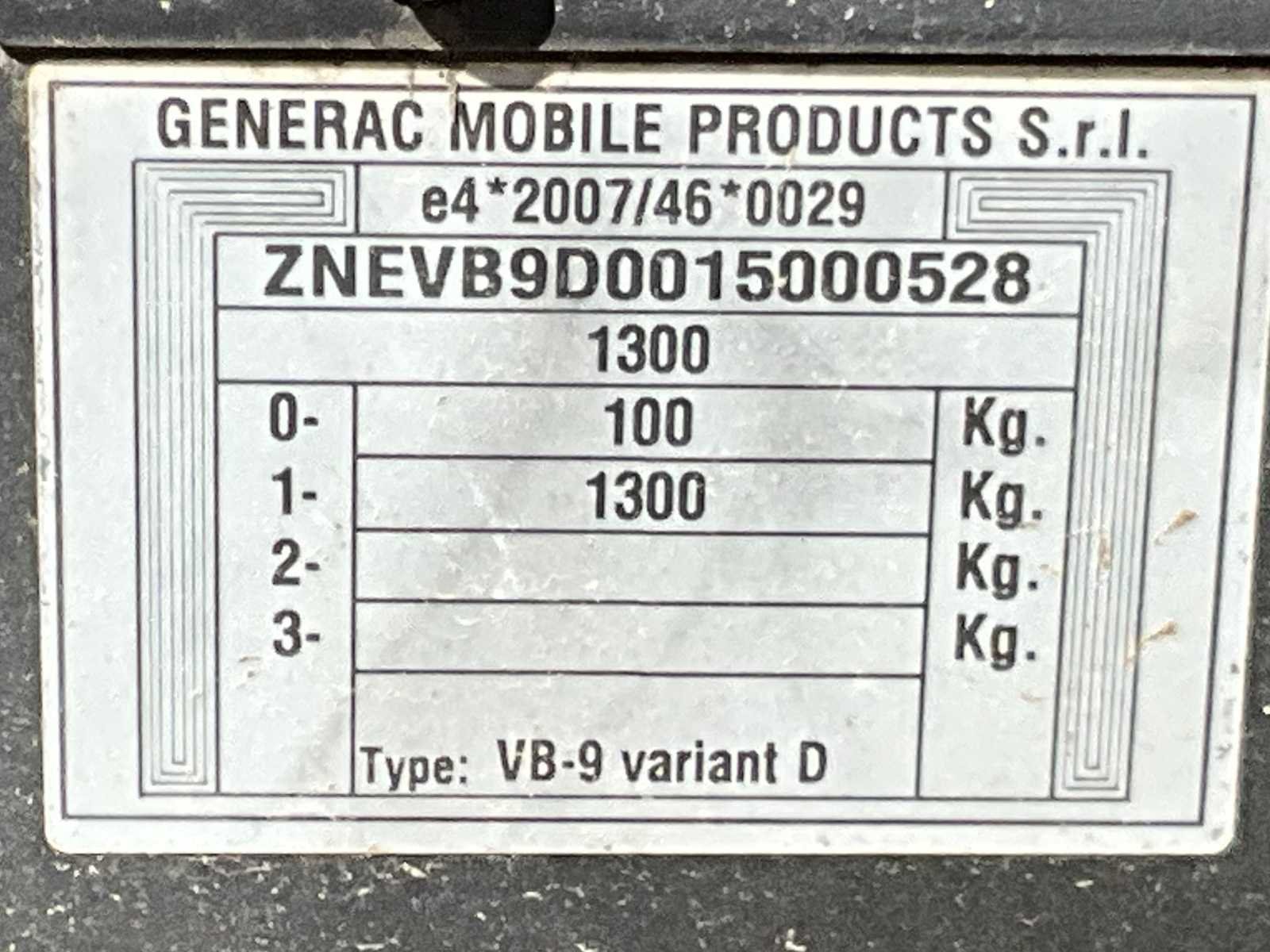 Lengte 2400 mm; breedte 1450 mm; hoogte 2400 mm; Kohler diesel motor; Linz alternator; 4x240 Watt LED lamp; 230 Volt aansluiting; 5 kVA; ingebouwde brandstoftank; hydraulische mast; maximale masthoogte circa 8 meter; afgelezen urenstand 2227 uur; lichtsensor; heftruck vorksleuven; 4x stelvoet; hijsoog; working condition; (de koper dient bij transport over de weg zelf te voorzien in een geldig kenteken; een 7 of 9 polige aansluitstekker of verloopstuk met kabel (verlengsnoer kan ter plaatse tegen betaling aangekocht worden); eventueel extra lichtbalk); Belgische kentekenpapieren; gelijkvormigheidsattest; (Q-ABN-535) Nee Merk: TowerLight Type: VB-9 LED Bouwjaar: 2015 Chassisnummer: ZNEVB9D0015000528 + 1503208 Aantal assen: 1 Ledig gewicht: 1100kg