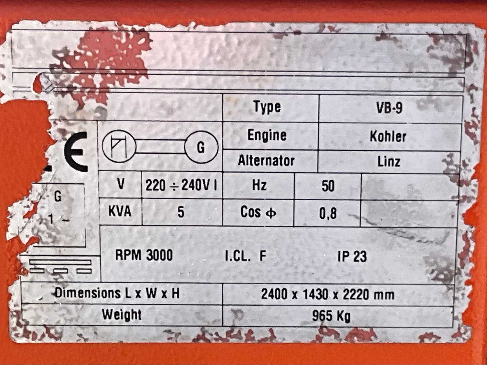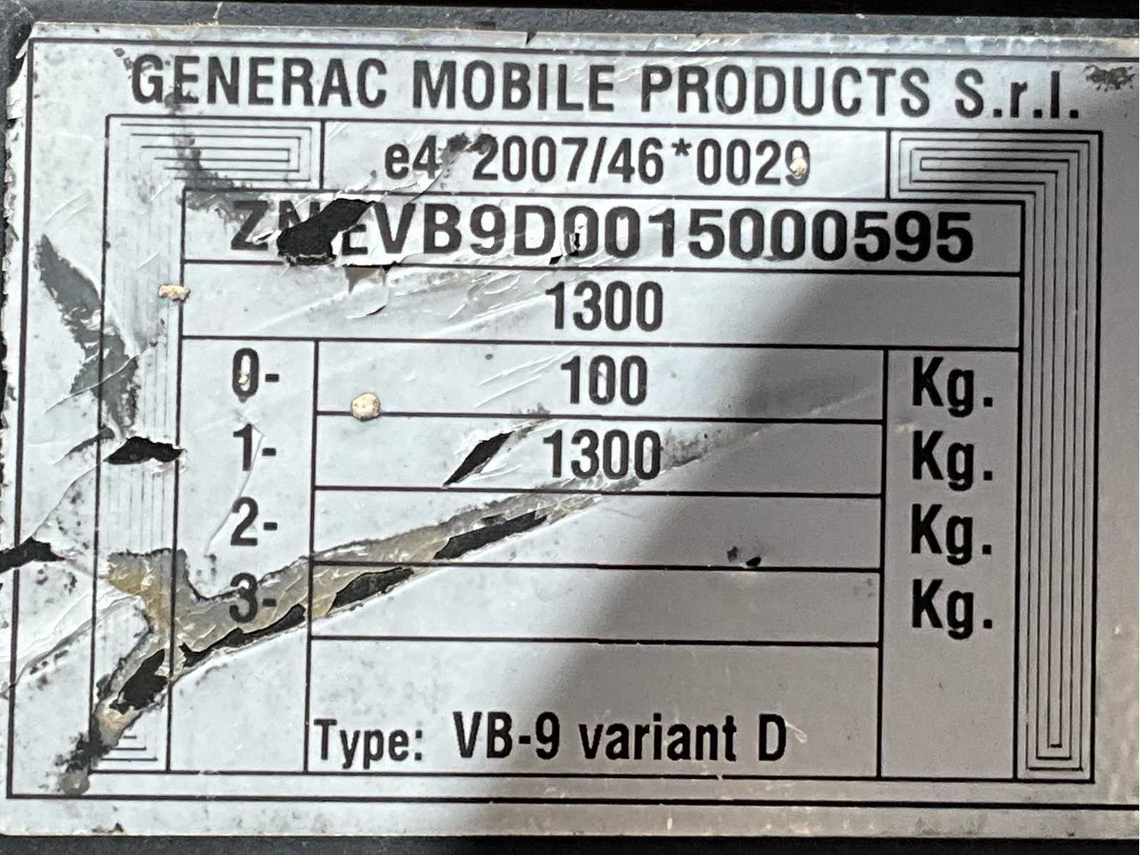 Lengte 2400 mm; breedte 1450 mm; hoogte 2400 mm; Kohler diesel motor; Linz alternator; 6x240 Watt LED lamp; 230 Volt aansluiting; 5 kVA; ingebouwde brandstoftank; hydraulische mast; maximale masthoogte circa 8 meter; afgelezen urenstand 1963 uur; lichtsensor; heftruck vorksleuven; 4x stelvoet; hijsoog; working condition; (de koper dient bij transport over de weg zelf te voorzien in een geldig kenteken; een 7 of 9 polige aansluitstekker of verloopstuk met kabel (verlengsnoer kan ter plaatse tegen betaling aangekocht worden); eventueel extra lichtbalk); Duitse kentekenpapieren; gelijkvormigheidsattest; (B-FY8479) Nee Merk: TowerLight Type: VB-9 LED Bouwjaar: 2015 Chassisnummer: ZNEVB9D0015000595 + 1503275 Aantal assen: 1 Ledig gewicht: 1100kg