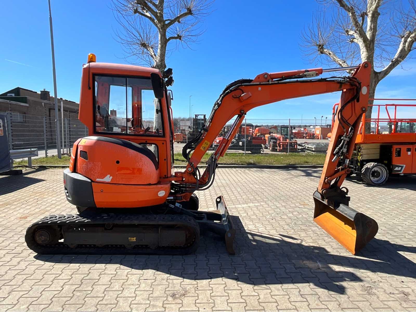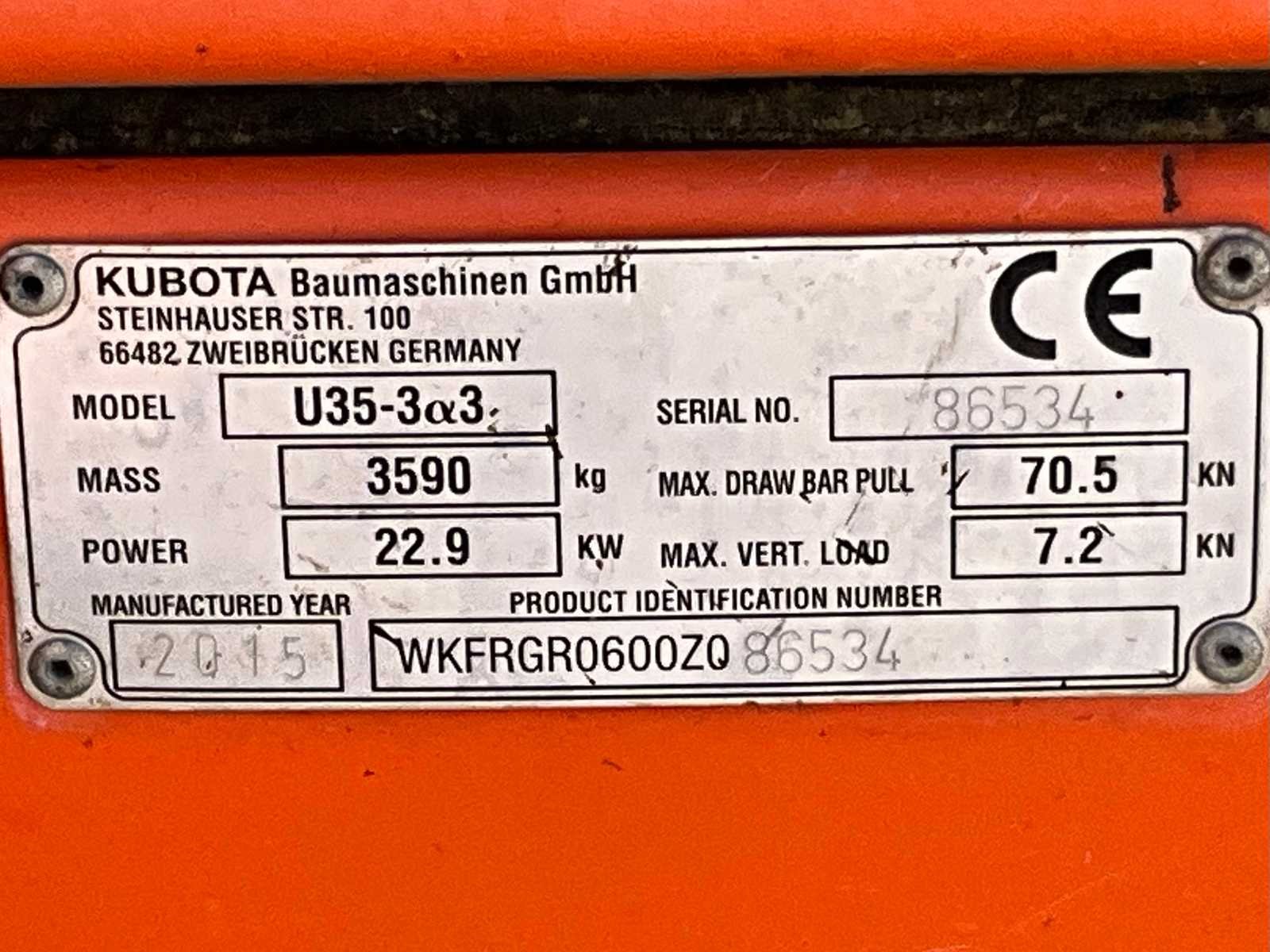 Gesloten cabine; knikarm; extra hydraulische aansluitingen; snelwissel; dozerblad breedte 1700 mm; working condition; Nee Merk: Kubota Type: U35-3A3 Bouwjaar: 2015 Serienummer: WKFRGR0600Z086534 Merk motor: Kubota Motorvermogen (kW): 22.9kW Aantal cilinders: 4 Brandstof: diesel Max. werkbereik: 5400mm Max. graafdiepte: 3350mm Graafbak afm. l: 400mm Graafbak afm. b: 1300mm Graafbak afm. h: 300mm Rups breedte: 300mm Afgelezen urenstand: 1944 Eigen gewicht: 3700kg Totale afmeting L: 4900mm Totale afmeting Breedte: 1700mm Totale afmeting Hoogte: 2500mm