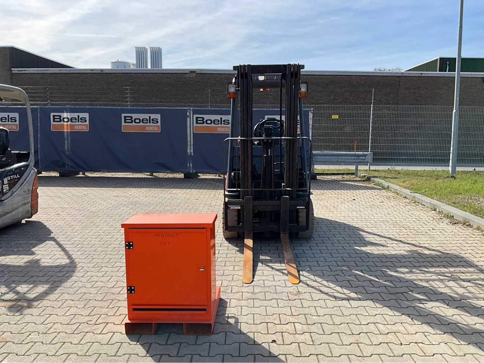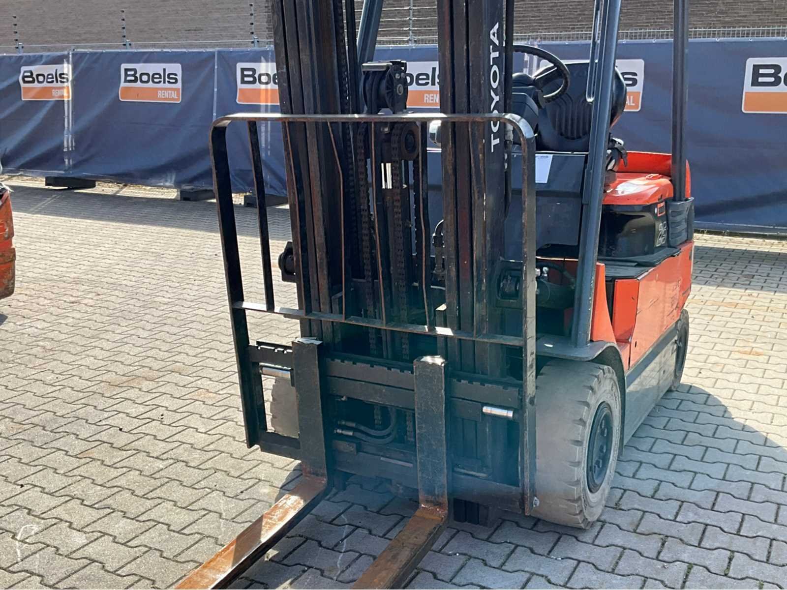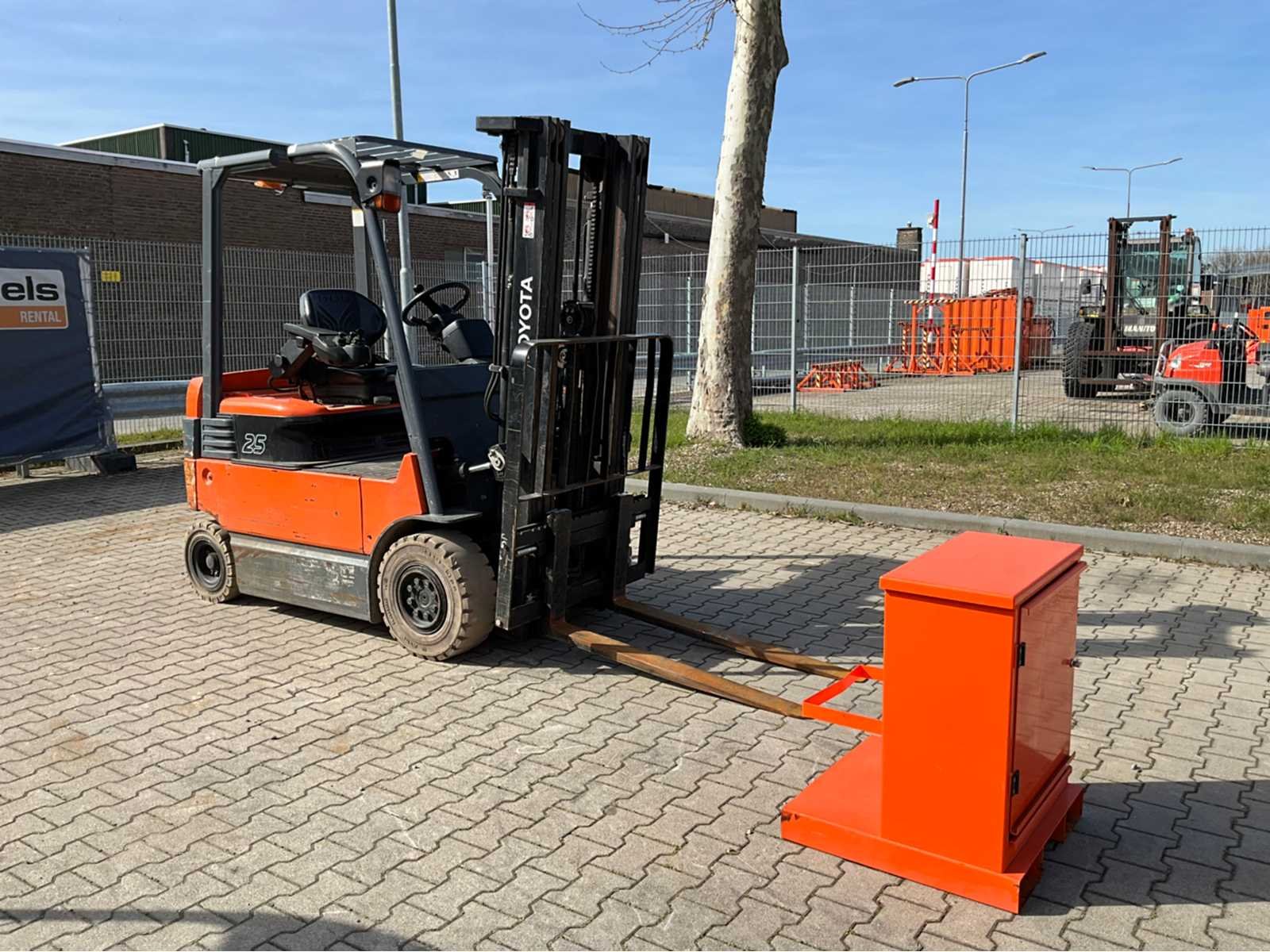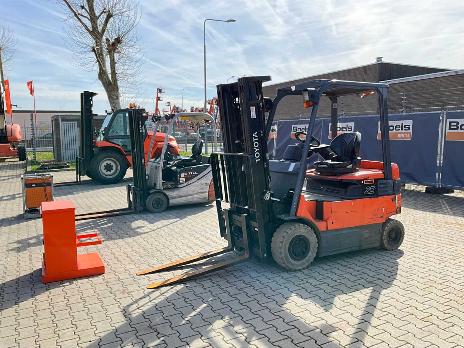 FEM2; working condition; Nee Merk: Toyota Type: 7FBMF25 Bouwjaar: 2012 Serienummer: 7FBMF2519260 Brandstof: Elektrisch Mast: Triple Soort band: Volrubber banden Aantal wielen: 4 Free-lift: true Side-shift: true Triple mast: true Eigen gewicht: 4700kg Hefvermogen: 2500kg Lepellengte: 1200mm Max. hefhoogte: 5000mm Vol rubber banden: true Minimale doorrijhoogte: 2400mm Totale afmeting L: 3600mm Totale afmeting Breedte: 1200mm Totale afmeting Hoogte: 2350mm