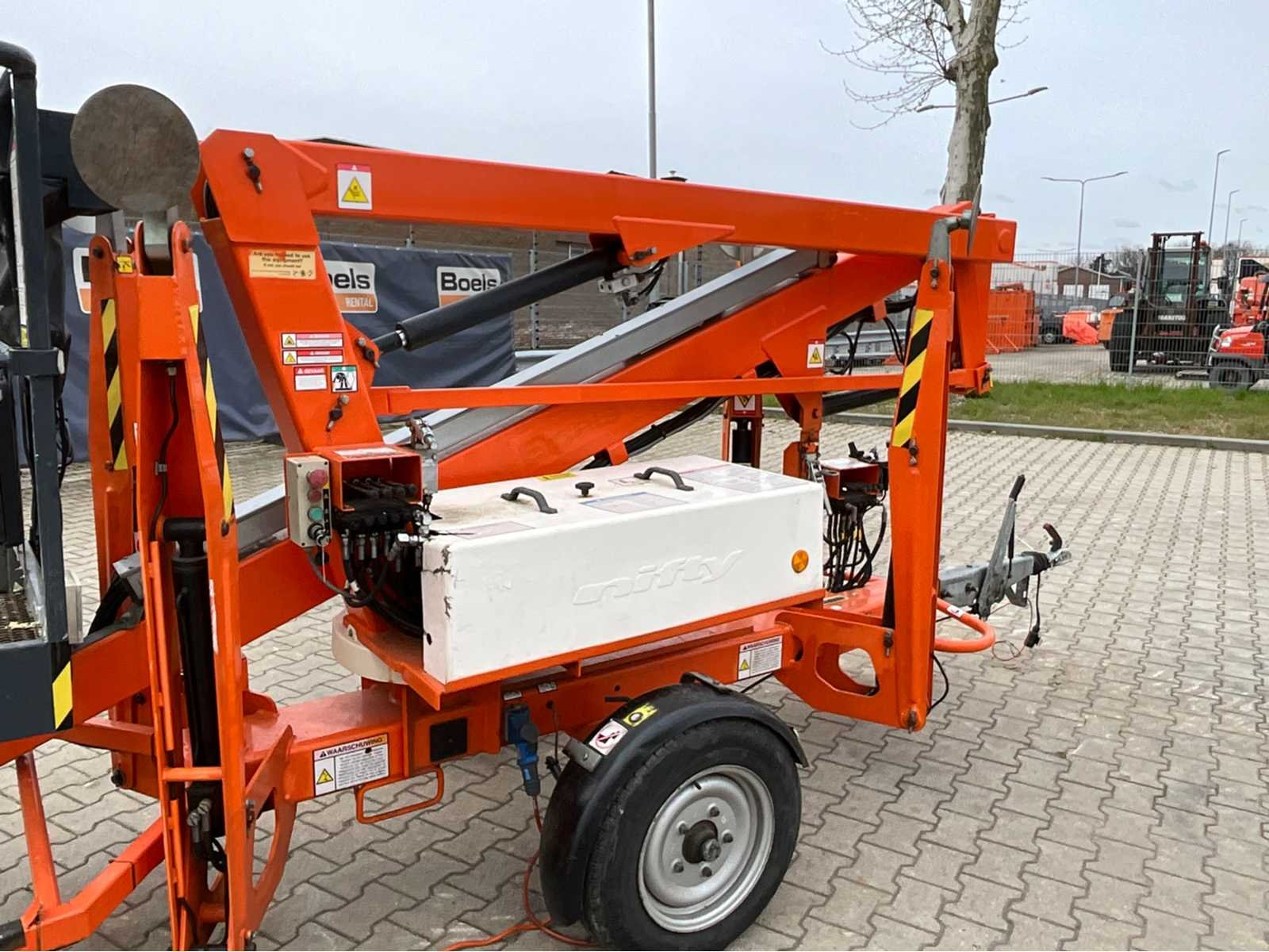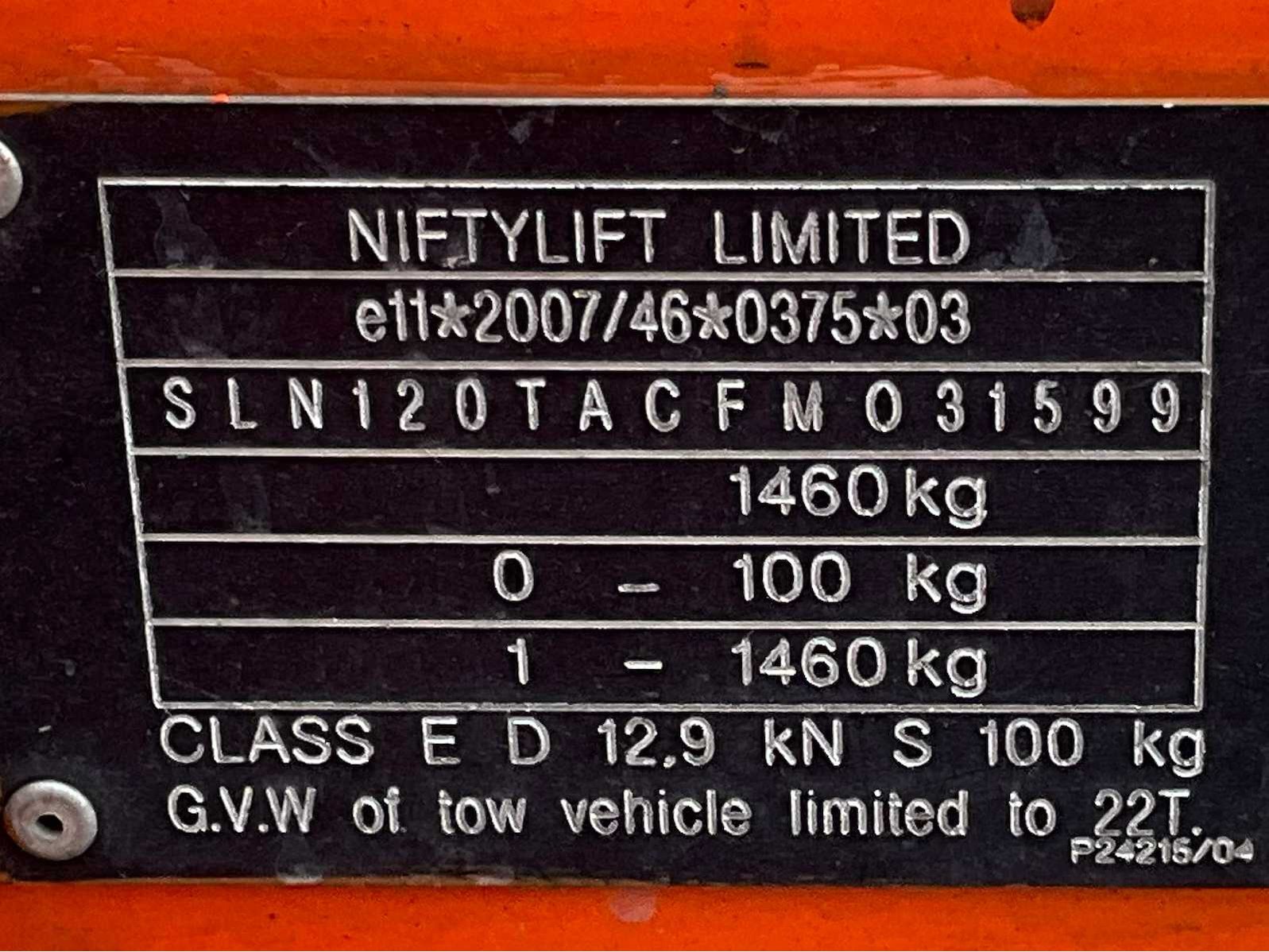 Knik telescoop hoogwerker aanhangwagen; enkel assige aanhangwagen; wielas in breedte verstelbaar; platform vloerhoogte 10200 mm; 230 Volt elektrische bediening; kooibediening; 4x hydraulische neerklapbare stempelvoet; afstempelvlak 3550x3550 mm; oplooprem; neuswiel; chassisnummer SLN120TACFM031599; working condition; (de koper dient bij transport over de weg zelf te voorzien in een geldig kenteken; een 7 of 9 polige aansluitstekker of verloopstuk met kabel (verlengsnoer kan ter plaatse tegen betaling aangekocht worden); eventueel extra lichtbalk); Nederlandse kentekenpapieren; zonder gelijkvormigheidsattest; (47-WN-KL) Nee Merk: Niftylift Type: Nifty 120 TAC Bouwjaar: 2015 Serienummer: 04 31599 Elektrisch: true Telescoop hoogwerker: true Knikarm hoogwerker: true Werkhoogte: 12200mm Horizontale rijkwijdte: 5000mm Plateau afm. l: 900mm Plateau afm. b: 600mm Platform capaciteit: 200kg Eigen gewicht: 1400kg Totale afmeting L: 4500mm Totale afmeting Breedte: 1500mm Totale afmeting Hoogte: 1900mm