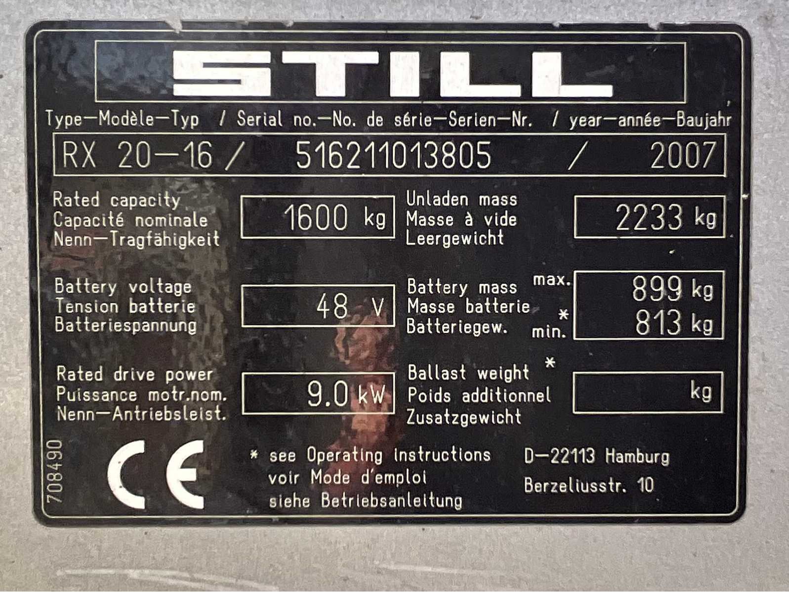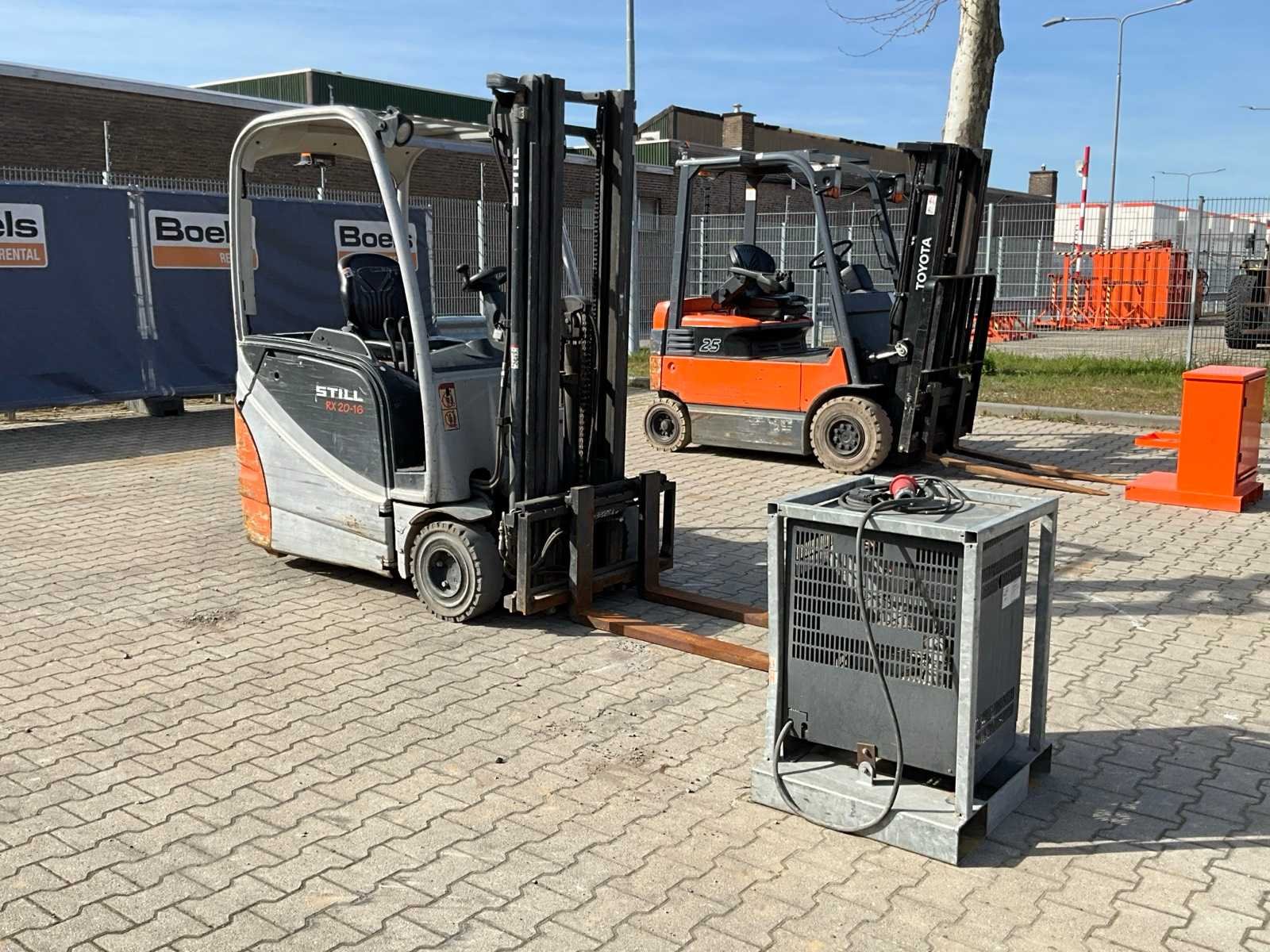 Acculader 48 Volt; fem2; achterkap beschadigd; working condition; Nee Merk: Still Type: RX20-16 Bouwjaar: 2007 Serienummer: 516211013805 Brandstof: Elektrisch Mast: Triple Soort band: Volrubber banden Aantal wielen: 3 Afgelezen urenstand: 2828 Free-lift: true Side-shift: true Triple mast: true Eigen gewicht: 3200kg Hefvermogen: 1600kg Lepellengte: 1200mm Max. hefhoogte: 4900mm Vol rubber banden: true Minimale doorrijhoogte: 2180mm Totale afmeting L: 3200mm Totale afmeting Breedte: 1100mm Totale afmeting Hoogte: 2200mm