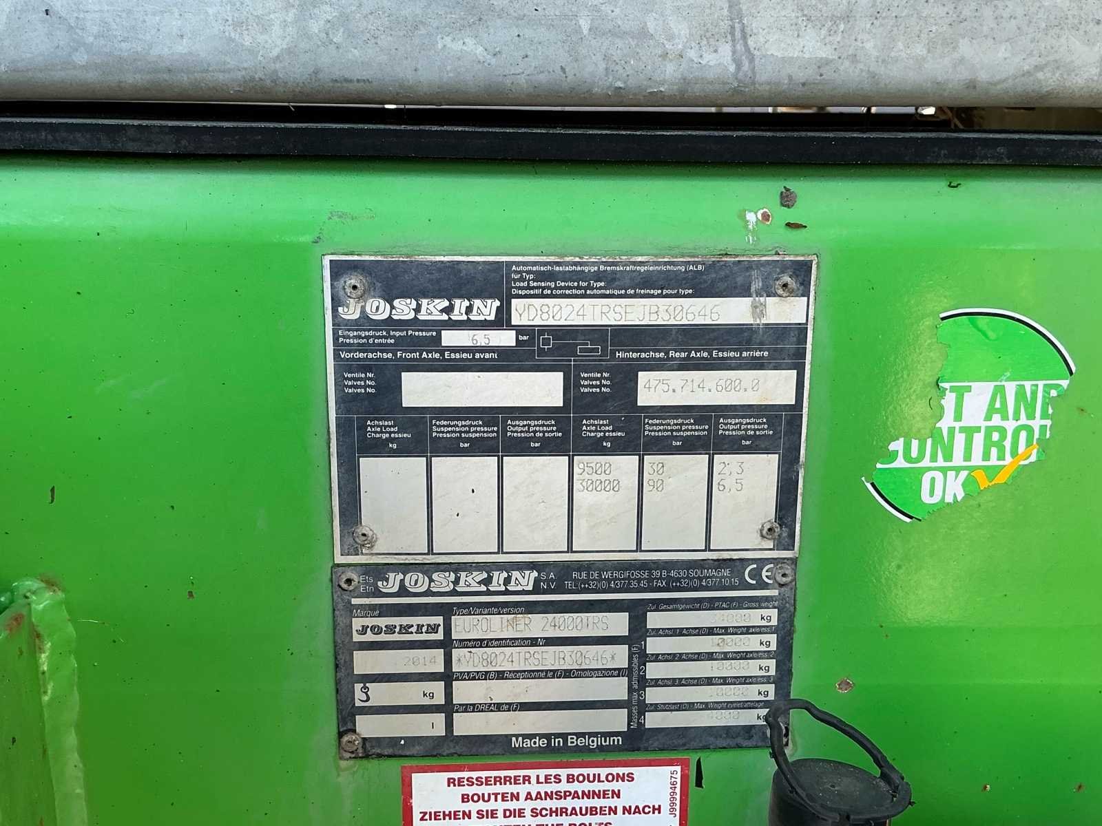 Joskin Euroliner 24000TRS Mest/Watertank 24.000 liter tankinhoud Bouwjaar: 2014 3 assen 750/60 R30,5 banden Battioni Pagani MEC 5000 D60 pomp Kogelkop aansluiting Stuuras Luchtremmen Zwenkbare arm met vulslang / zuigslang Draaibare spuitmond op bovenzijde tank Joskin bedieningskast Hefinrichting achterijde Aftakasaandrijving inclusief aftakas LED Verlichting Kogelkop aansluiting Stuuras Luchtremmen Afgelopen jaren gebruikt als watertank Nee Merk: Joskin Type: Euroliner 24000TRS Bouwjaar: 2014 Serienummer: YD8024TRSEJB30646 Kenteken: LHK12X Tankinhoud: 24m³ Bandenmaat: 750/60 R30.5 Zuigarm: true Hefinrichting: true Doseercomputer: true Totale afmeting L: 12000mm Totale afmeting Breedte: 3200mm Totale afmeting Hoogte: 4400mm