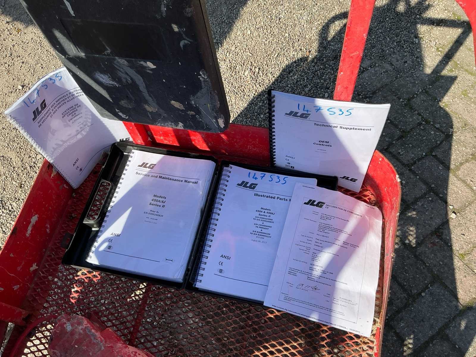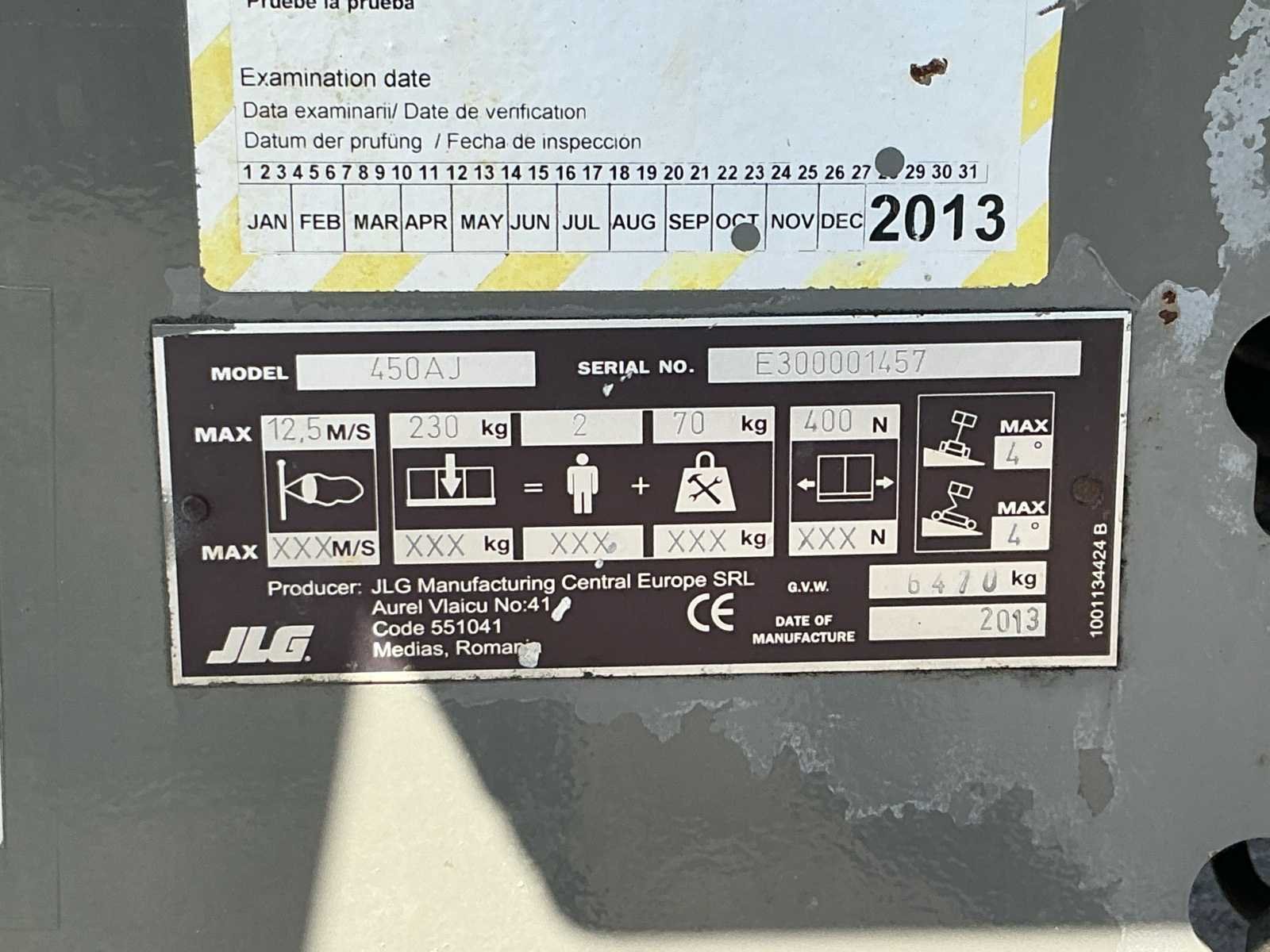 12,5 M/S, 400N, Hellingsvermogen: 45% (4WD), Draaibereik toren: ±355° , Platformrotatie: ±180° Nee Merk: JLG Type: 450AJ Bouwjaar: 2013 Serienummer: E300001457 Diesel: true Elektrisch: true Motorvermogen (kW): 49kW Knikarm hoogwerker: true Werkhoogte: 16500mm Horizontale rijkwijdte: 8000mm Plateau afm. l: 1800mm Plateau afm. b: 750mm Platform capaciteit: 230kg Afgelezen urenstand: 3662 Eigen gewicht: 6470kg Totale afmeting L: 4900mm Totale afmeting Breedte: 2350mm Totale afmeting Hoogte: 2550mm