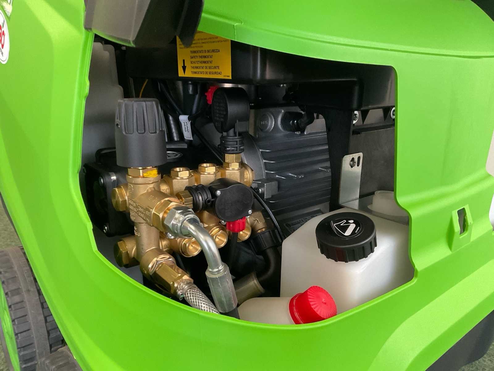 Gelakt stalen frame, schokbestendige beschermkap, 4 grote wielen, openklapbare front cover voor eenvoudige toegang tot componenten, ECO-modus (automatisch 60 °C, ca. 25% minder brandstofverbruik en uitstoot), bedieningspaneel met signaal- en controlelampjes, traploze drukregeling, brandstoftank 18 liter, opbergruimte voor pistool/lans/slang en nozzles, roestvrijstalen branderketel 40 kW, 4-polige asynchroon luchtgekoelde elektromotor met thermische beveiliging (S1, onderhoudsvrij), brandstofniveau-indicatie, radiale krukaspomp met messing pompkop en keramische plunjers, manometer, instelbare werkdruk, wateronthardingstank 2 liter, DTS vertraagd afvallend stopsysteem, IASF automatische uitschakeling na 20 min stilstand, FLC brandstofniveaucontrole, MLC micro-lekkage controle, DRP droogloopbeveiliging, NCC nozzle verstoppingscontrole, HBLS LED-signalen, MCL onderhoudscontrolelamp, FPS terugslagklep, IBD vertraagde branderontsteking, WHC urenteller, werkdruk tot 150 bar, waterdebiet tot 540 l/u, maximale watertemperatuur ca. 110 °C, vermogen ca. 2,7–2,8 kW, spanning 230 V, gewicht ca. 80 kg Nee Merk: Dibo Type: PW-H31 D1509P