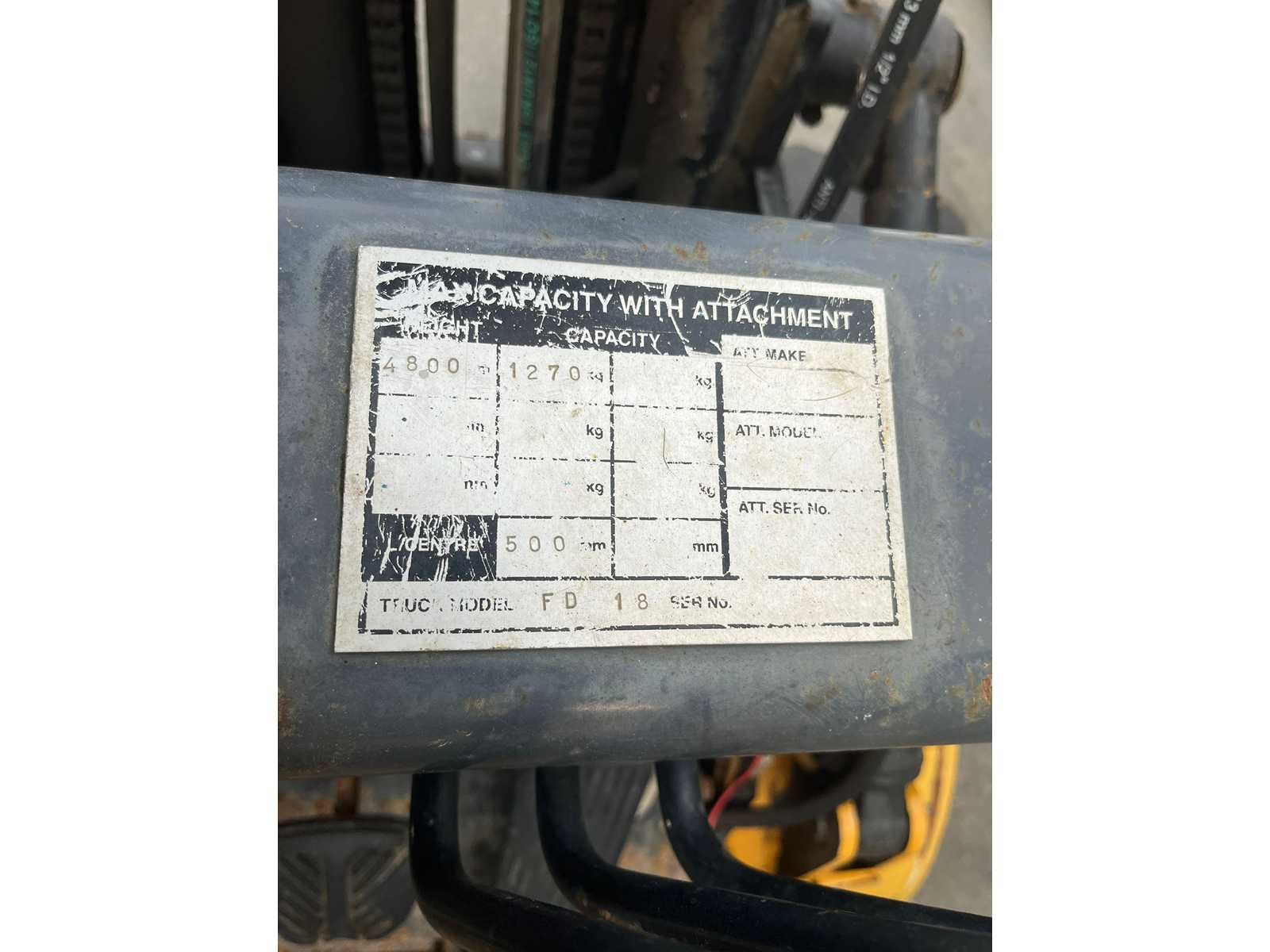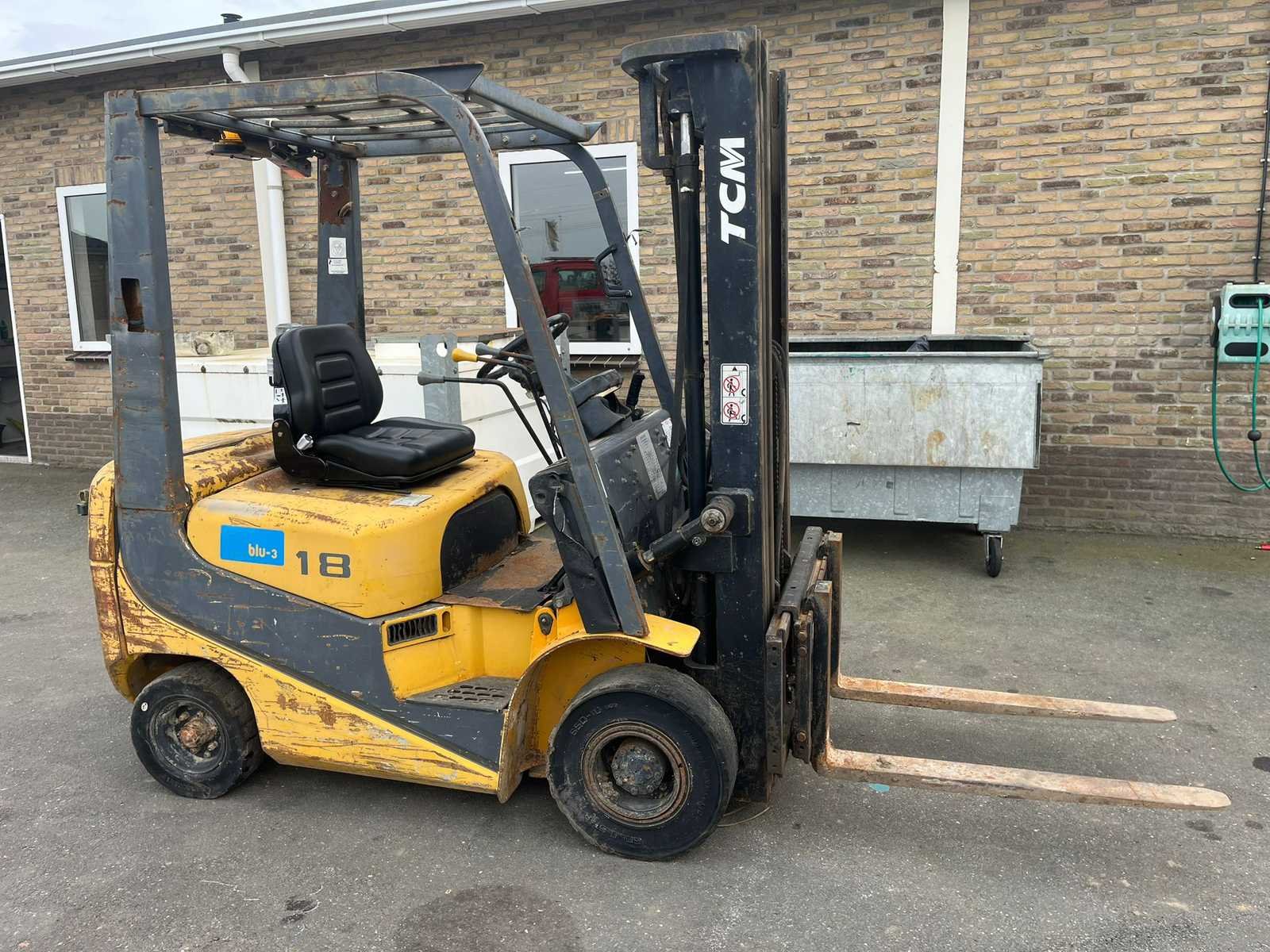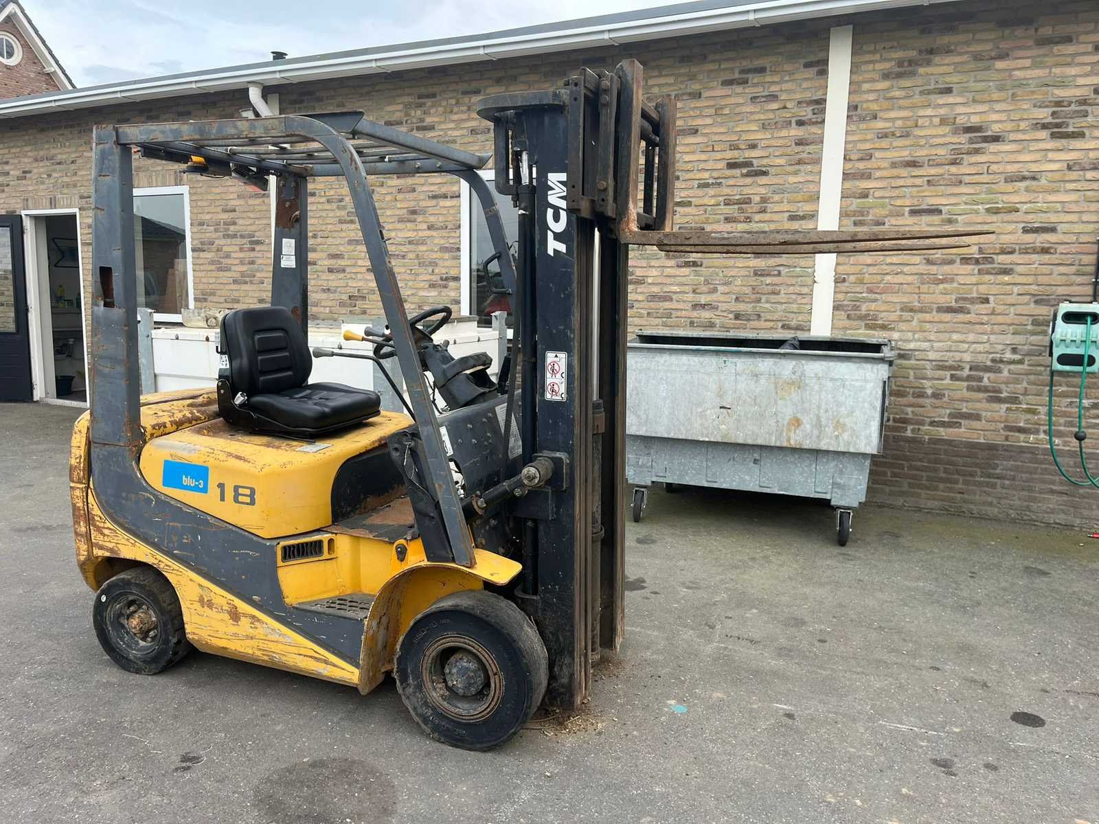 Lepels, lepelbord, triplex mast, side shift, free lift, Nee Merk: TCM Type: FD18T9H Bouwjaar: 2004 Serienummer: 19R15973 Brandstof: Diesel Mast: Triple Soort band: Volrubber banden Aantal wielen: 4 Afgelezen urenstand: 8399 Free-lift: true Side-shift: true Triple mast: true Hefvermogen: 1750kg Max. hefhoogte: 4800mm Vol rubber banden: true