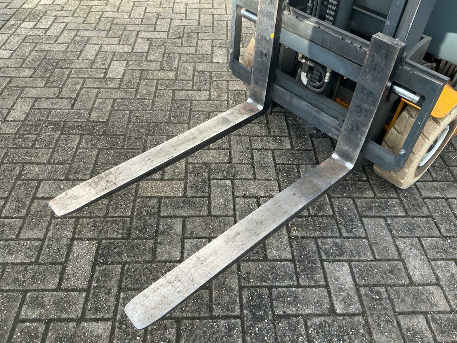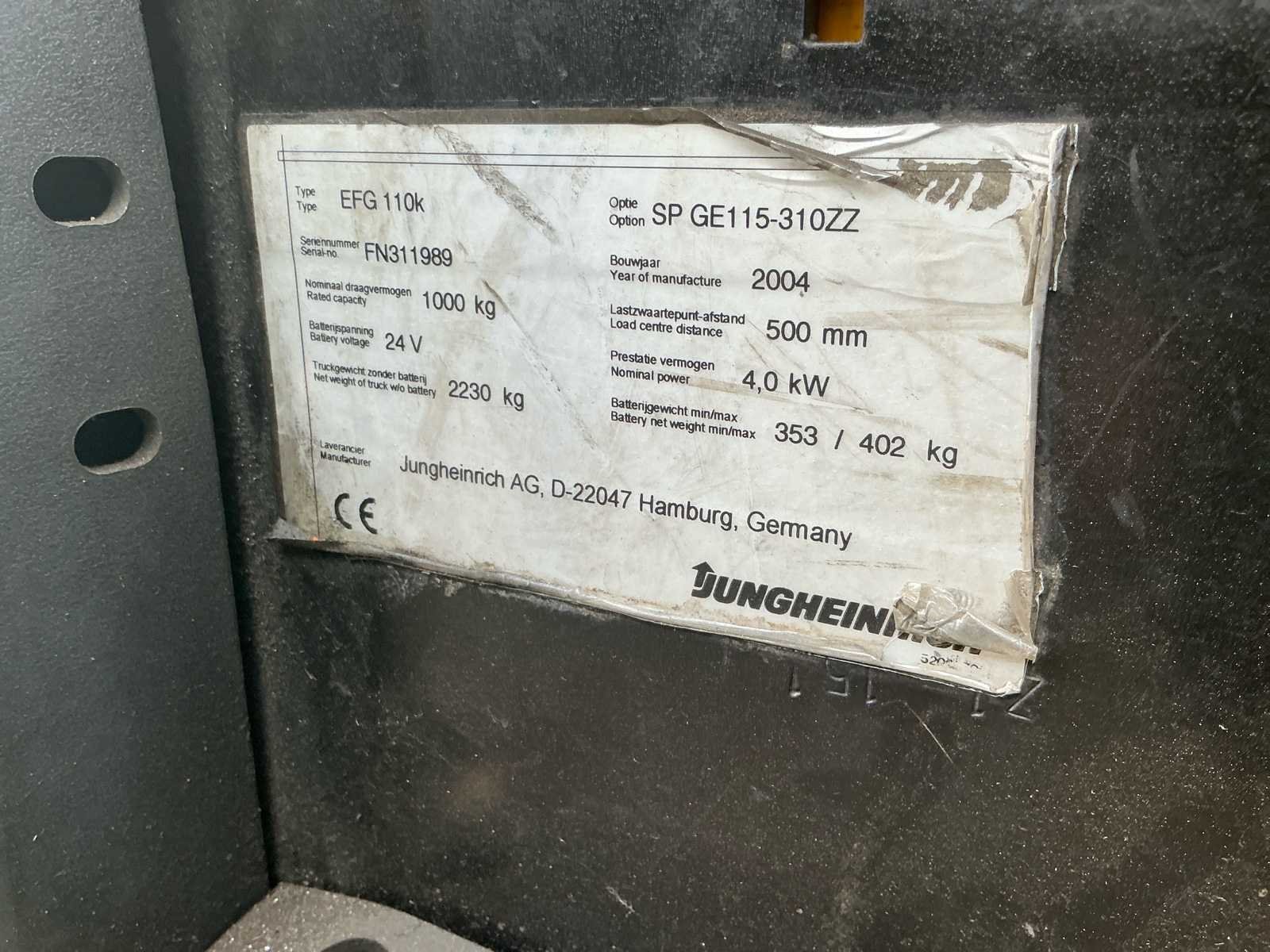 No Merk: Jungheinrich Type: EFG 110K Bouwjaar: 2004 Serienummer: FN311989 Brandstof: Elektrisch Aantal wielen: 3 Afgelezen urenstand: 5639 Accu lader: true Free-lift: true Side-shift: true Duplex mast: true Eigen gewicht: 2230kg Hefvermogen: 1000kg Lepellengte: 1100mm Max. hefhoogte: 31mm Vol rubber banden: true Minimale doorrijhoogte: 2080mm Totale afmeting L: 2600mm Totale afmeting Breedte: 1000mm Totale afmeting Hoogte: 2080mm