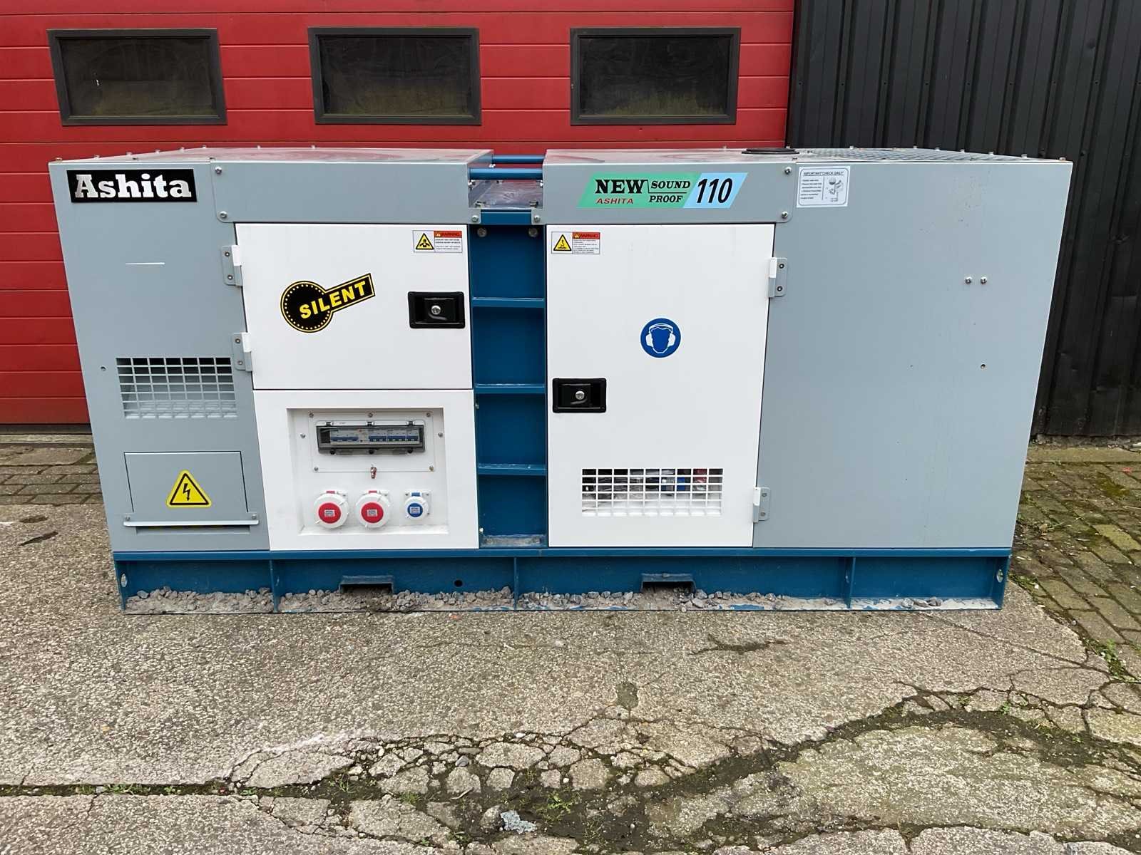 Voorzien van silent diesel generator; Generator vermogen: 110 kVA; Power factor: 0.8; Effectief vermogen: 88 kW; Spanning: 400 V / 230 V; Frequentie: 50 Hz; Fasen: 3-fase; Nominale snelheid: 1500 rpm; Motormodel: 4RT55-88D; Type: turbocharged dieselmotor; Aantal cilinders: 4; Cilinderinhoud: 5.3 L; Vermogen motor: 88 kW @ 1500 rpm; Lengte: 260 cm; Breedte: 110 cm; Hoogte: 131 cm; Gewicht: 2000 kg; 2× 400V CEE krachtstroom aansluitingen; 1× 230V CEE aansluiting; Automatische zekeringen (CHINT); Hoofdschakelaar / breaker; Silent canopy (geluidsarm); Digitale genset controller; Noodstop; Circuit breakers; Geluidsisolatiekast; Hefpunten / vorkheftruck openingen Nee Merk: Ashita power Type: AG3-110 Diesel: true