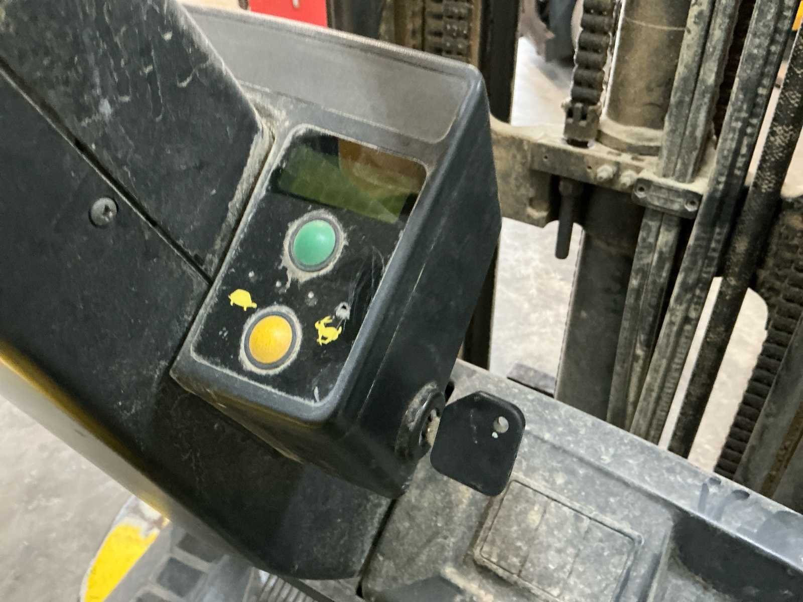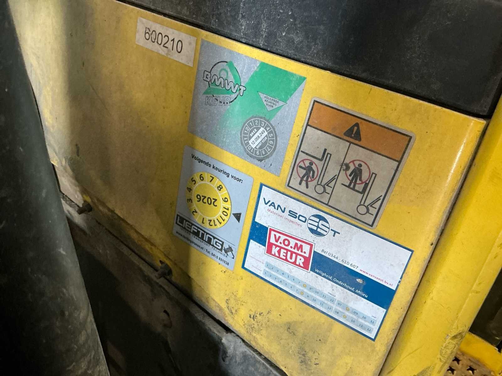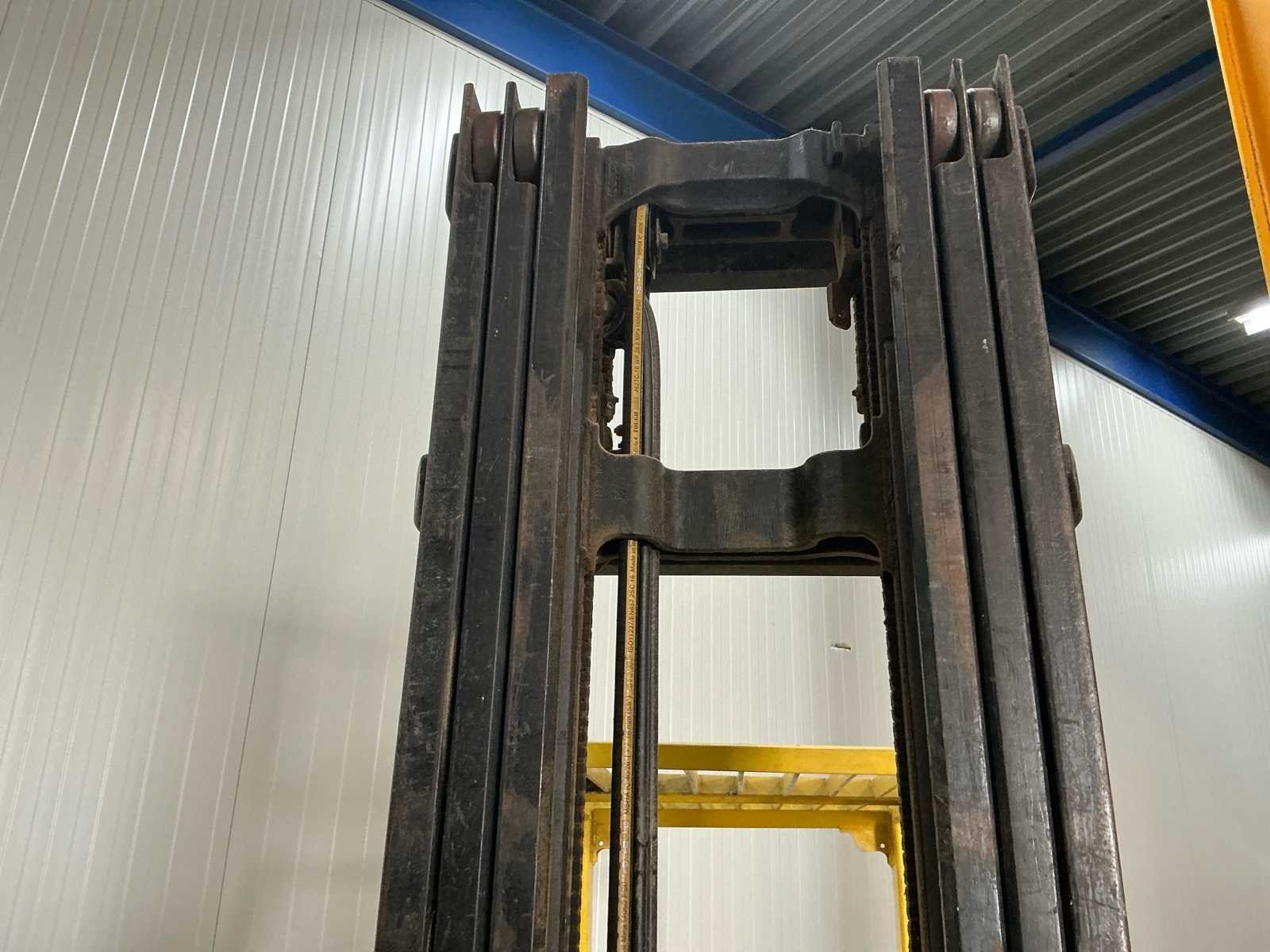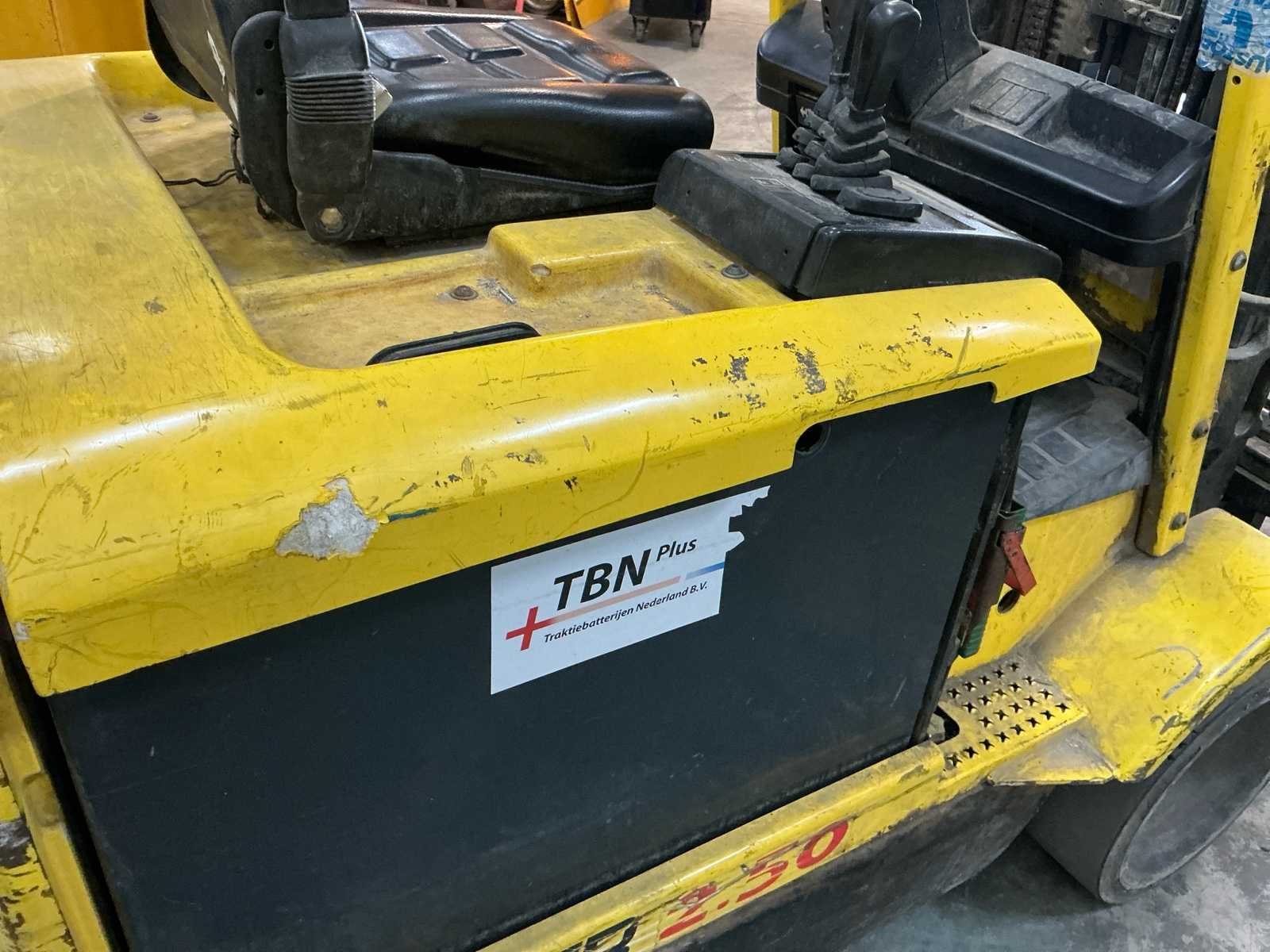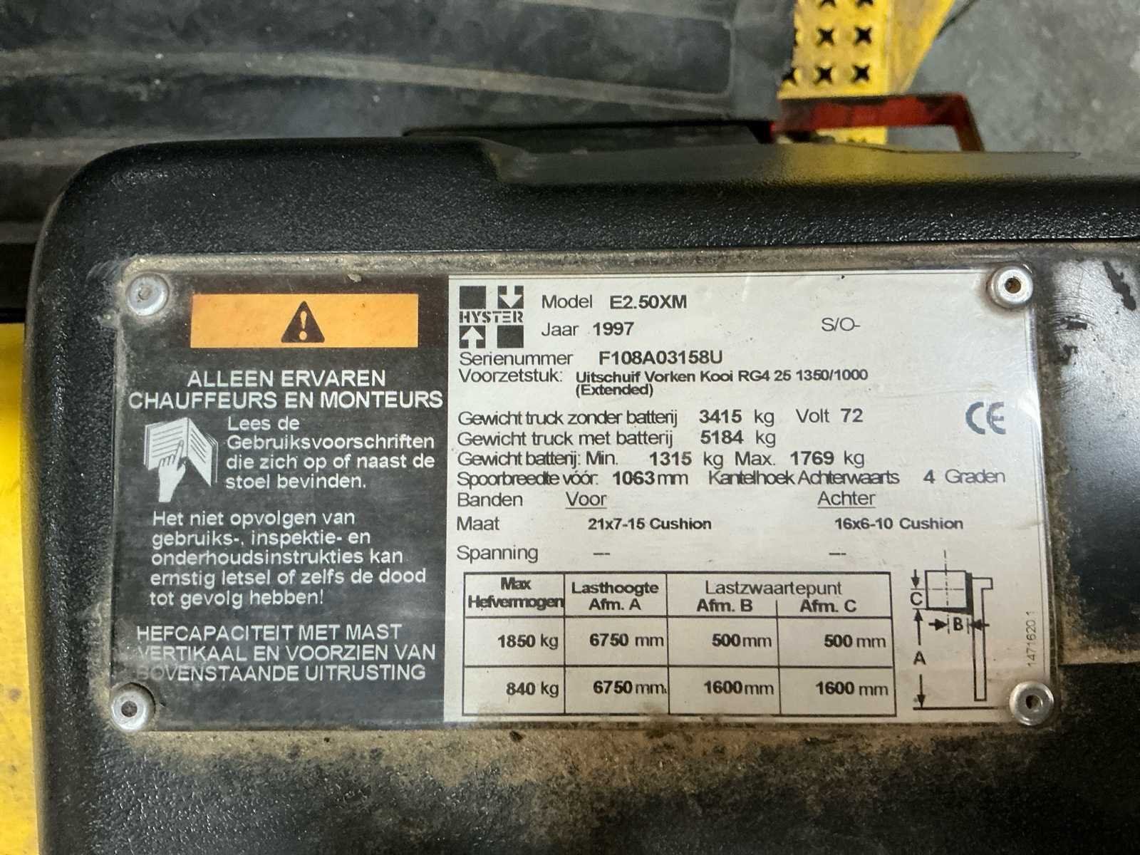 Voorzien van: metalen kooi, monotrolbediening Nee Merk: Hyster Type: E2.50XM Bouwjaar: 1997 Serienummer: F108A03158U Mast: Triple Aantal wielen: 4 Afgelezen urenstand: 8096 Free-lift: true Side-shift: true Triple mast: true Eigen gewicht: 5184kg Hefvermogen: 1850kg Lepellengte: 1200mm Vol rubber banden: true Minimale doorrijhoogte: 2860mm Totale afmeting L: 3200mm Totale afmeting Breedte: 1200mm Totale afmeting Hoogte: 2860mm