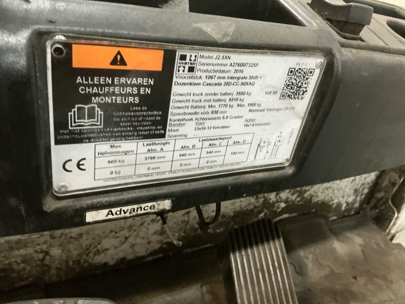 Voorzien van: verlichting, werkverlichting, nonmarkingbanden, acculader, bleuspot, rijrichtingschakelaar op hendel, achteruitkijkspiegel Nee Merk: Hyster Type: J2.5XN Bouwjaar: 2016 Serienummer: A276B07325P Brandstof: Electrisch Mast: Duplex Soort band: Nonmarking Aantal wielen: 4 Afgelezen urenstand: 15900 Accu lader: true Side-shift: true Duplex mast: true Eigen gewicht: 5510kg Hefvermogen: 2500kg Lepellengte: 920mm Max. hefhoogte: 3790mm Vol rubber banden: true Totale afmeting L: 3330mm Totale afmeting Breedte: 1120mm Totale afmeting Hoogte: 2350mm