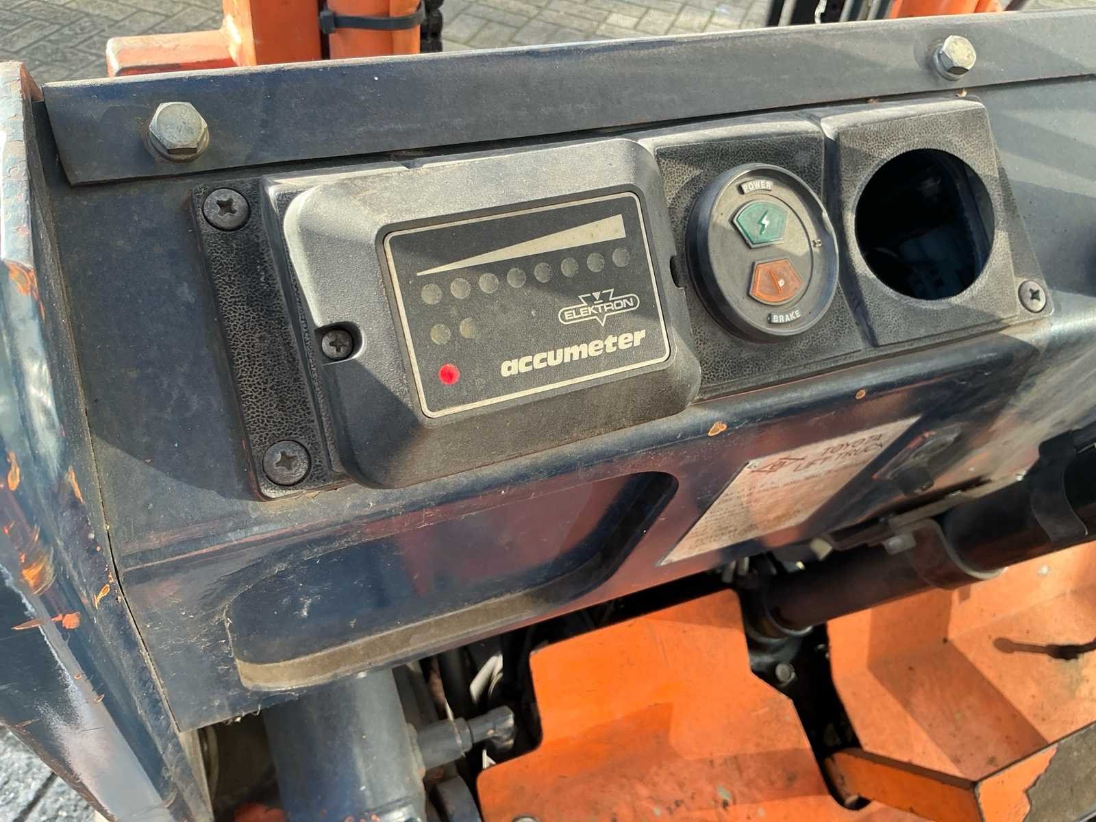 Zonder lader, bouwjaar onbekend, Nee Merk: Toyota Type: 4FB20 Serienummer: 4FB25-13561 Brandstof: Elektrisch Aantal wielen: 4 Side-shift: true Duplex mast: true Eigen gewicht: 2810kg Hefvermogen: 2000kg Lepellengte: 1200mm Max. hefhoogte: 4000mm Vol rubber banden: true Minimale doorrijhoogte: 2550mm Totale afmeting L: 3300mm Totale afmeting Breedte: 1100mm Totale afmeting Hoogte: 2550mm