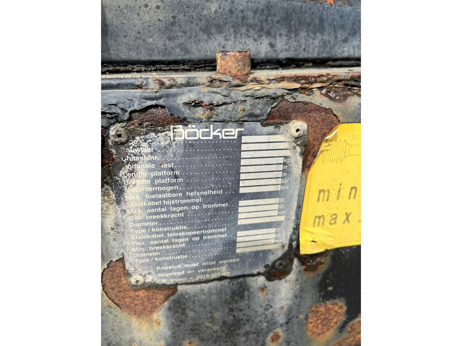 Bocker hd26/1-6lh 26 mtr 300 kg Met kenteken Honda gx360 elektrisch gestart watergekoeld ( staat al een paar jaar stil) Afstand bediening Laadbak in delen neerklabaar en draaibaar Bezichtiging alleen op afspraak Nee Merk: Bocker Type: HD26/1-6LH 26m Max. platformhoogte: 26m Max. belasting: 300kg Merk motor: Honda GX360