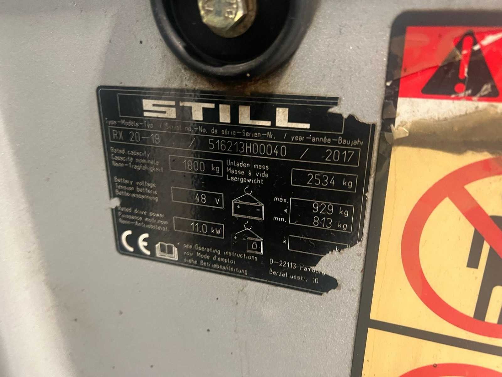 Dichte cabine. Bezichtiging op afspraak! Nee Merk: Still Type: RX20-18 Bouwjaar: 2017 Brandstof: Elektrisch Mast: Triplex Aantal wielen: 3 Afgelezen urenstand: 20748 Free-lift: true Side-shift: true Hydraulisch verstelbare lepels: true Triple mast: true Eigen gewicht: 3800kg Hefvermogen: 1800kg Lepellengte: 1200mm Hefhoogte: 5070mm Vol rubber banden: true Totale afmeting L: 2100mm Totale afmeting Breedte: 1100mm Totale afmeting Hoogte: 2495mm