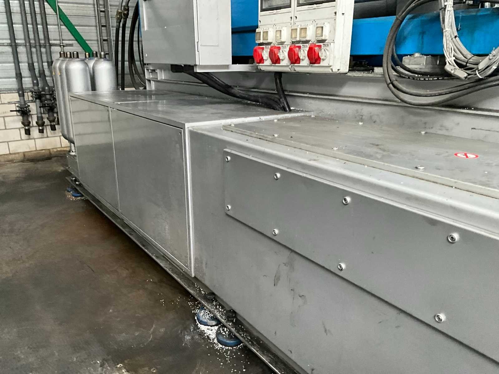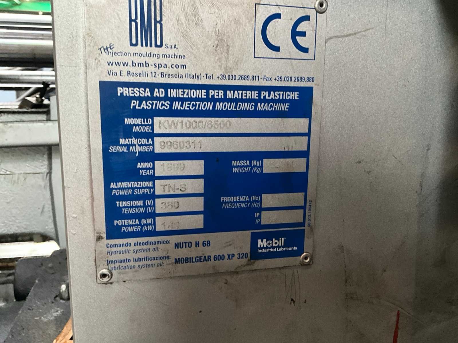 Afstand tussen de holmen 1120x1010 mm, gat centreerring vaste plaat Diameter 250 mm, minimale inbouw hoogte 450 mm, maximale open loopweg 1400 mm, maximale opening (hydraulisch) 2600 mm, kerntrek 4, Machine is in 2014 gedemonteerd, gereviseerd (Italië) en opnieuw in bedrijf gesteld, voorzien van hydraulische schroef aandrijving, 189 Kw, documentatie, Let op! afhalen op afspraak Nee Merk: BMB Type: KW1000/6500 Bouwjaar: 1999 Serienummer: 9960311 Schroefdiameter: 100mm Injectievolume: 3800cm³ Sluitkracht: 10000kN Matrijs afm. b: 1660mm Matrijs afm. h: 1550mm Digitale besturing: true Afgelezen urenstand: 73148 Aansluiting: 400V Machinegewicht: 62000kg Totale afmeting L: 13000mm Totale afmeting Breedte: 2900mm Totale afmeting Hoogte: 3500mm