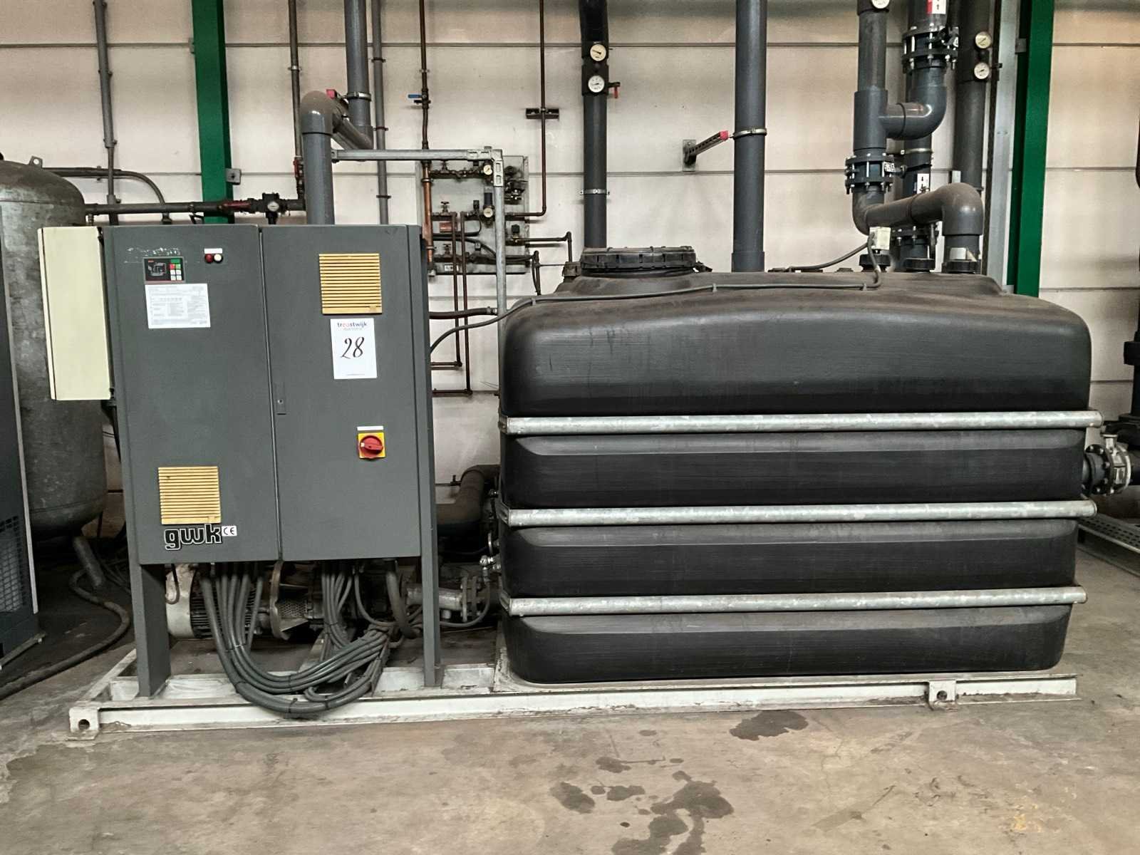 Bestaande uit 1x koelwater pompunit, voorzien van 2x 3000 ltr koelwater tanks, 2x circulatie pomp, besturingskast, vloeroppervlakte 3800x2500 mm, 1x condensor op het dak, voorzien van 10x ventilator, condensor afmeting (LxWxH) 9000x2550x2200 mm, Let op! afhalen op afspraak, leidingwerk niet inbegrepen, koudemiddel is reeds afgetapt Nee Merk: GWK Aansluiting: 400V