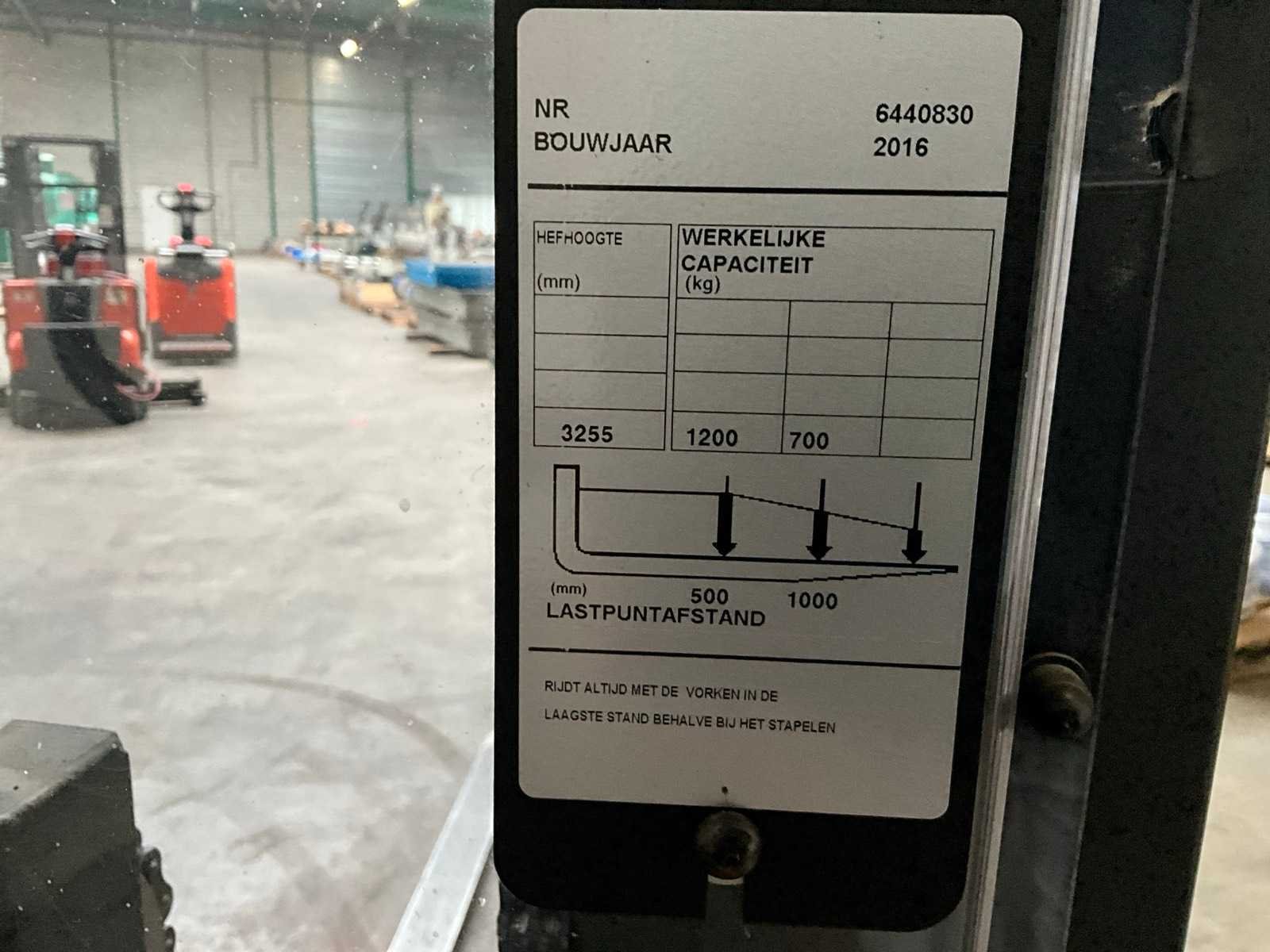 1300 mm tussen de steunwielen, voorzien van triple doorkijkmast Nee Merk: BT Type: Staxio SWE120S Bouwjaar: 2016 Hefvermogen: 1200kg Hefhoogte: 3255mm Lepellengte: 1900mm Afgelezen urenstand: 421 Eigen gewicht: 1300kg Minimale doorrijhoogte: 1700mm Totale afmeting L: 3000mm Totale afmeting Breedte: 1500mm Totale afmeting Hoogte: 1700mm Meerij stapelaar: true Accu lader: true