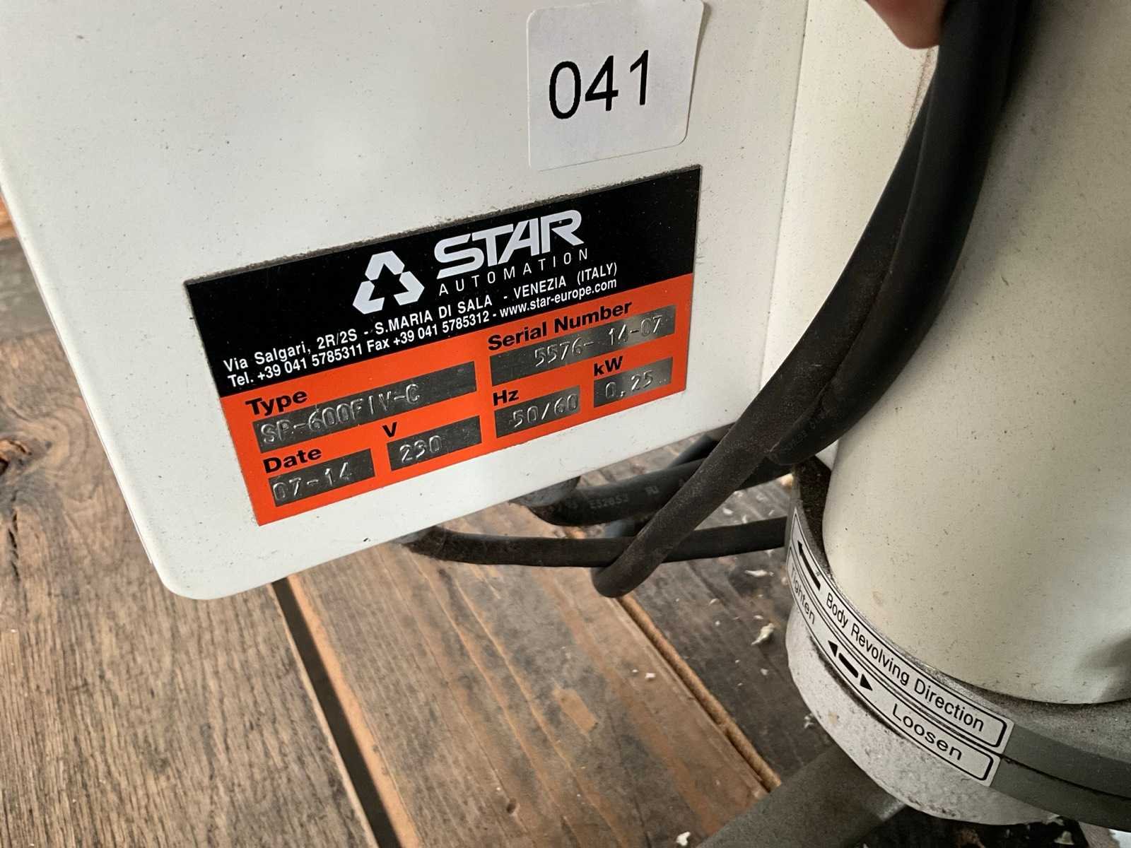 Voorzien van schakelkast en afstandsbediening, niet compleet Nee Merk: Star Type: SP-600F IV C Bouwjaar: 2014 Serienummer: 5576-14-07 Aansluiting: 230V Totale afmeting L: 800mm Totale afmeting Breedte: 300mm Totale afmeting Hoogte: 1300mm