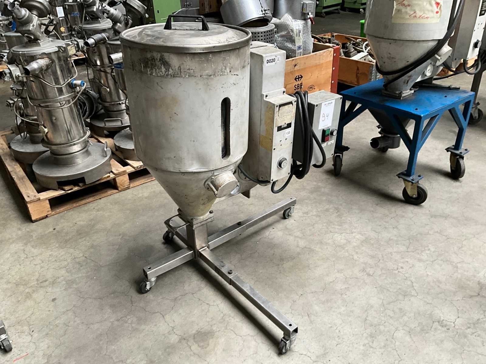 Voorzien van mobiel onderstel, trechter diameter 41 cm Nee Merk: Stougaard Argos Type: CS-1 Bouwjaar: 1998 Vermogen: 3kW Aansluiting: 380V Totale afmeting L: 700mm Totale afmeting Breedte: 700mm Totale afmeting Hoogte: 1000mm