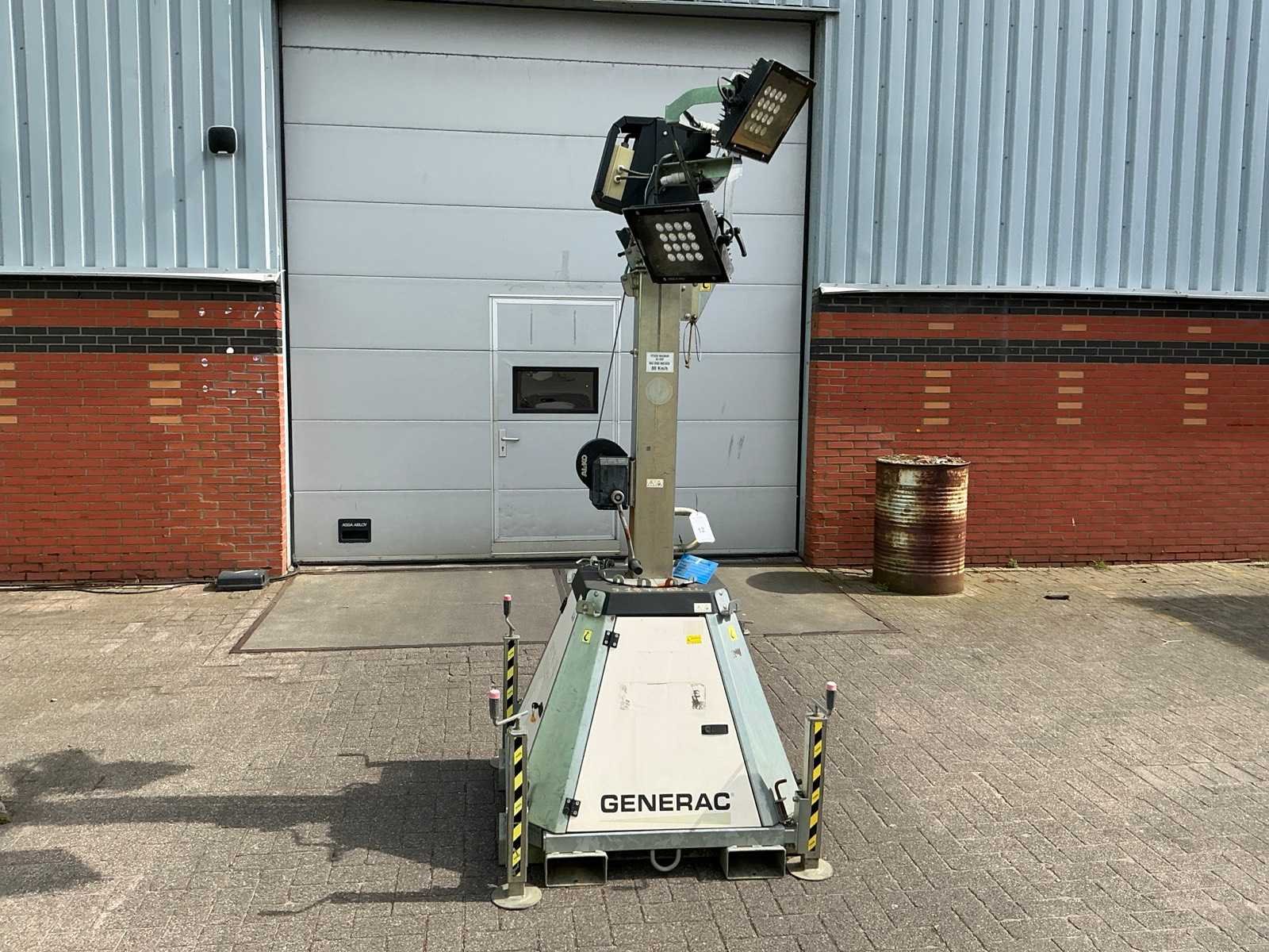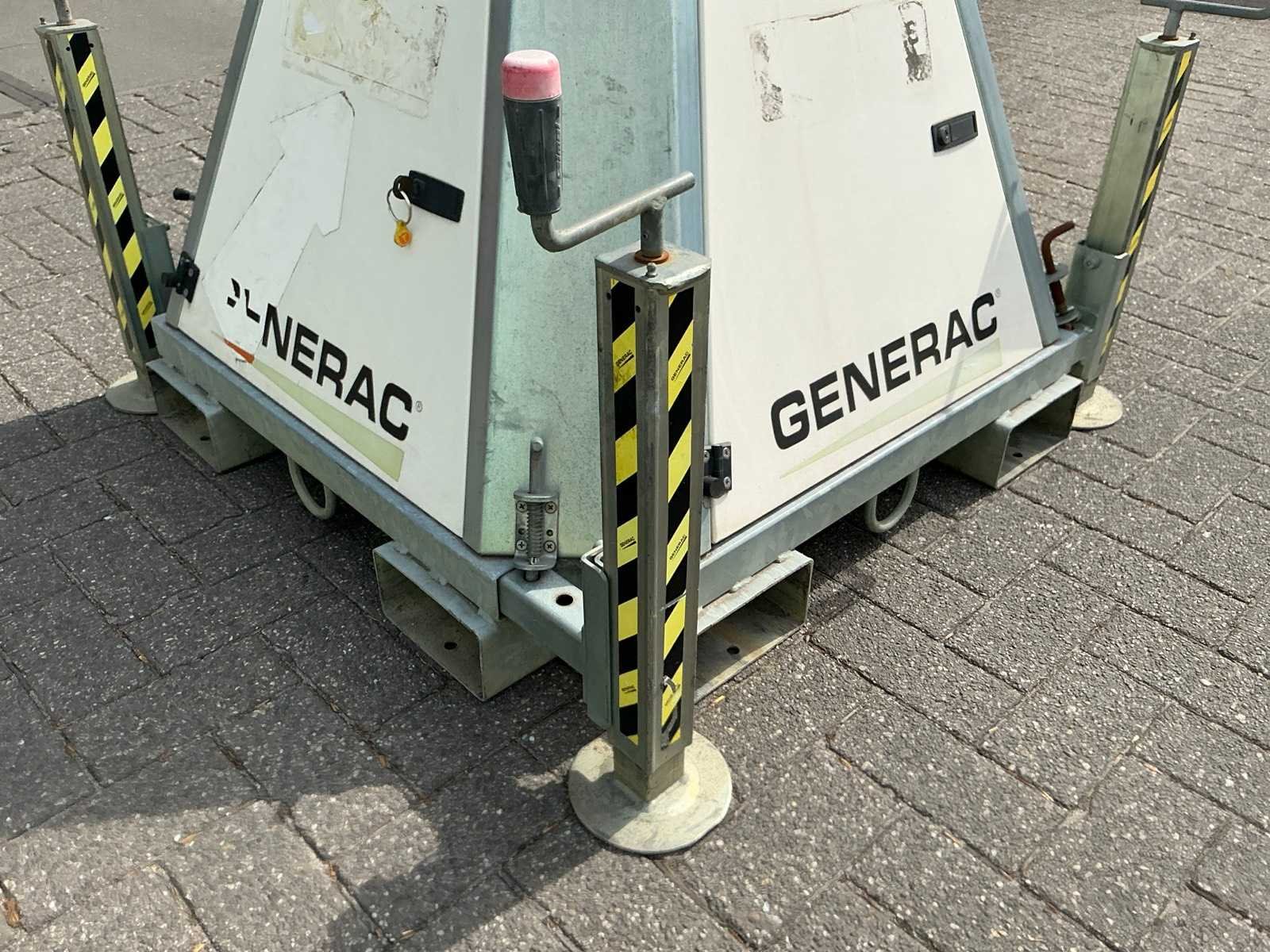 Stationaire lichtmast voorzien van 4 LED lampen 4x150W (31x28cm), In hoogte verstelbaar tot ca 8,5 meter, Stempel Nee Merk: GENERAC Type: CTF 10 Mt Bouwjaar: 2017 Serienummer: 1706007 LED: true Vermogen: 150W Statief: true Totale afmeting L: 1100mm Totale afmeting Breedte: 1100mm Totale afmeting Hoogte: 2660mm