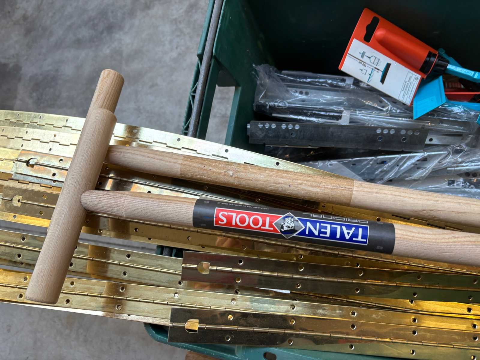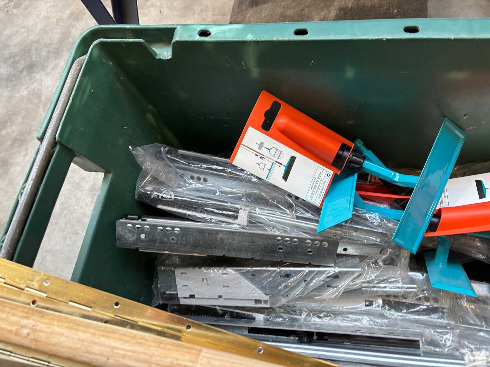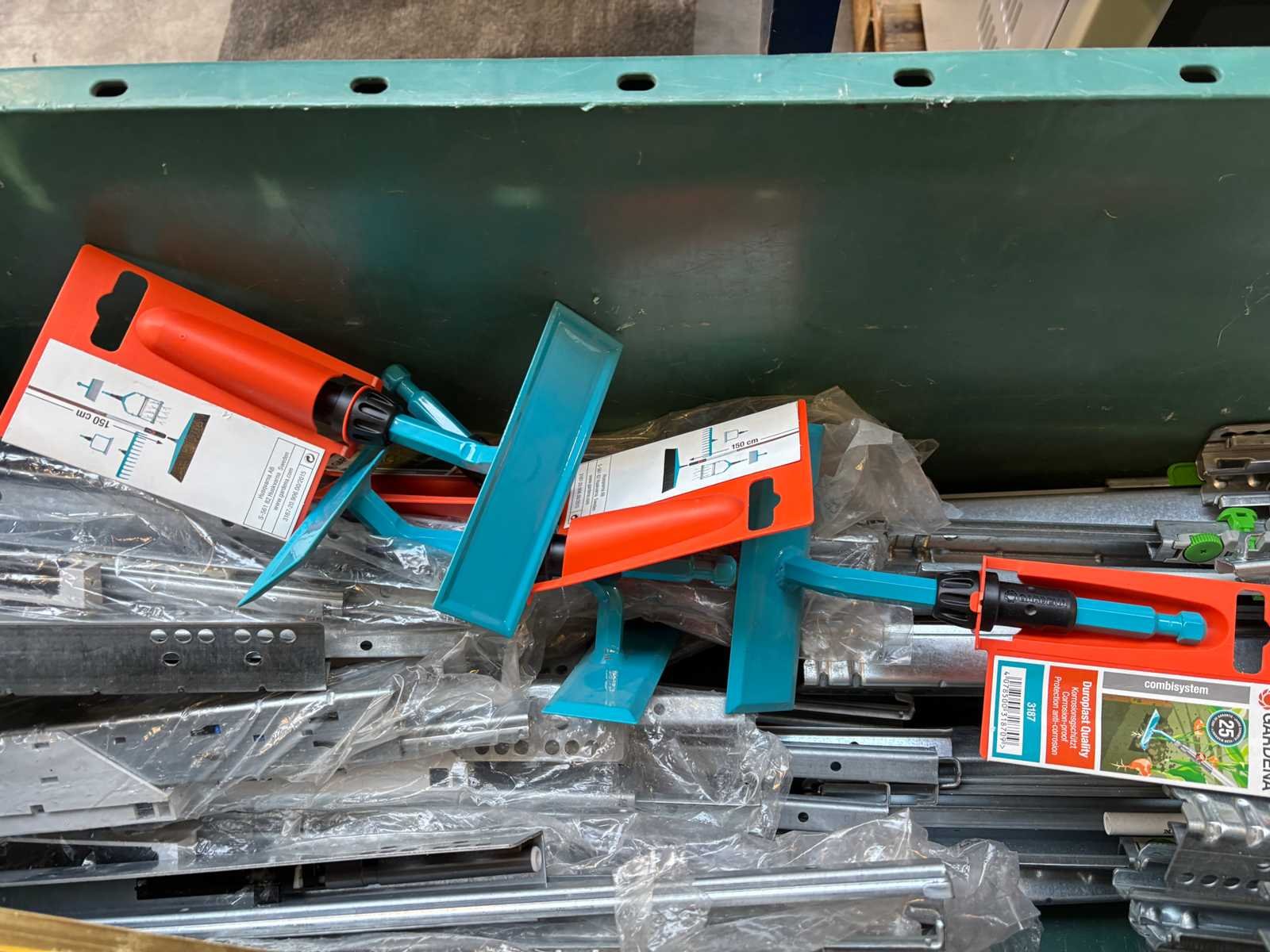 Krat hoort niet bij het kavel Nee Bestaande uit: Krat met inhoud 1e: Gardena tuin gereedschap 2e: Piano scharnieren 3e: Kantstekers 4e: Rail geleiders