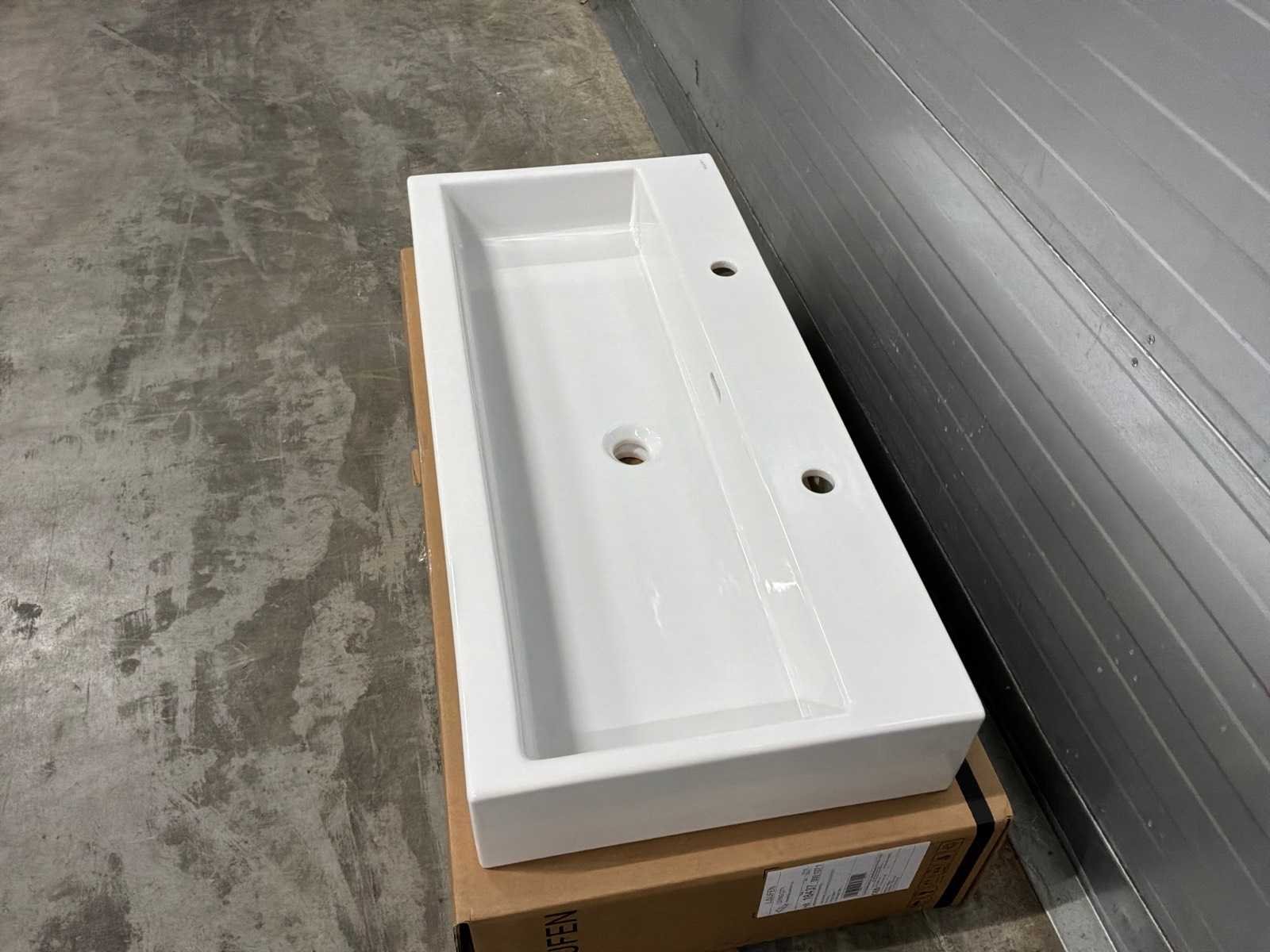 Dubbele wastafel voor in meubel met 2 kraangaten, wit H8184370001071 Nee Merk: Laufen Living Model: Dubbele Lengte: 46cm Breedte: 100cm
