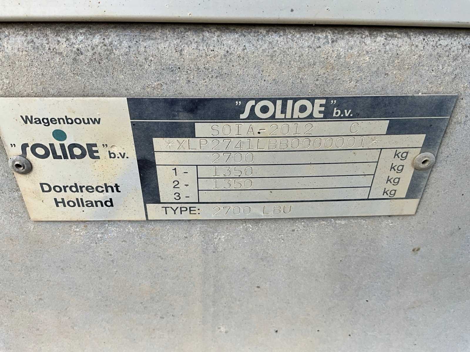 Voorzien van stroomgenerator, olie opslagvaten, pomp unit, slanghaspels met vulpistolen, 13-polige stekker, zijkleppen + achterklep, rondom te openen huif, Nee Merk: Solide Model: 2700 LBU Bouwjaar: 2011 Chassisnummer: XLP2741LBB0000001 Aantal assen: 2 Laadbak afmeting l: 410cm Laadbak afmeting b: 190cm Ledig gewicht: 590kg Zeiltrailer: true Datum eerste toelating: 2011-01-11 Kenteken: 32-WG-RZ Hoogte: 220cm Lengte: 530cm