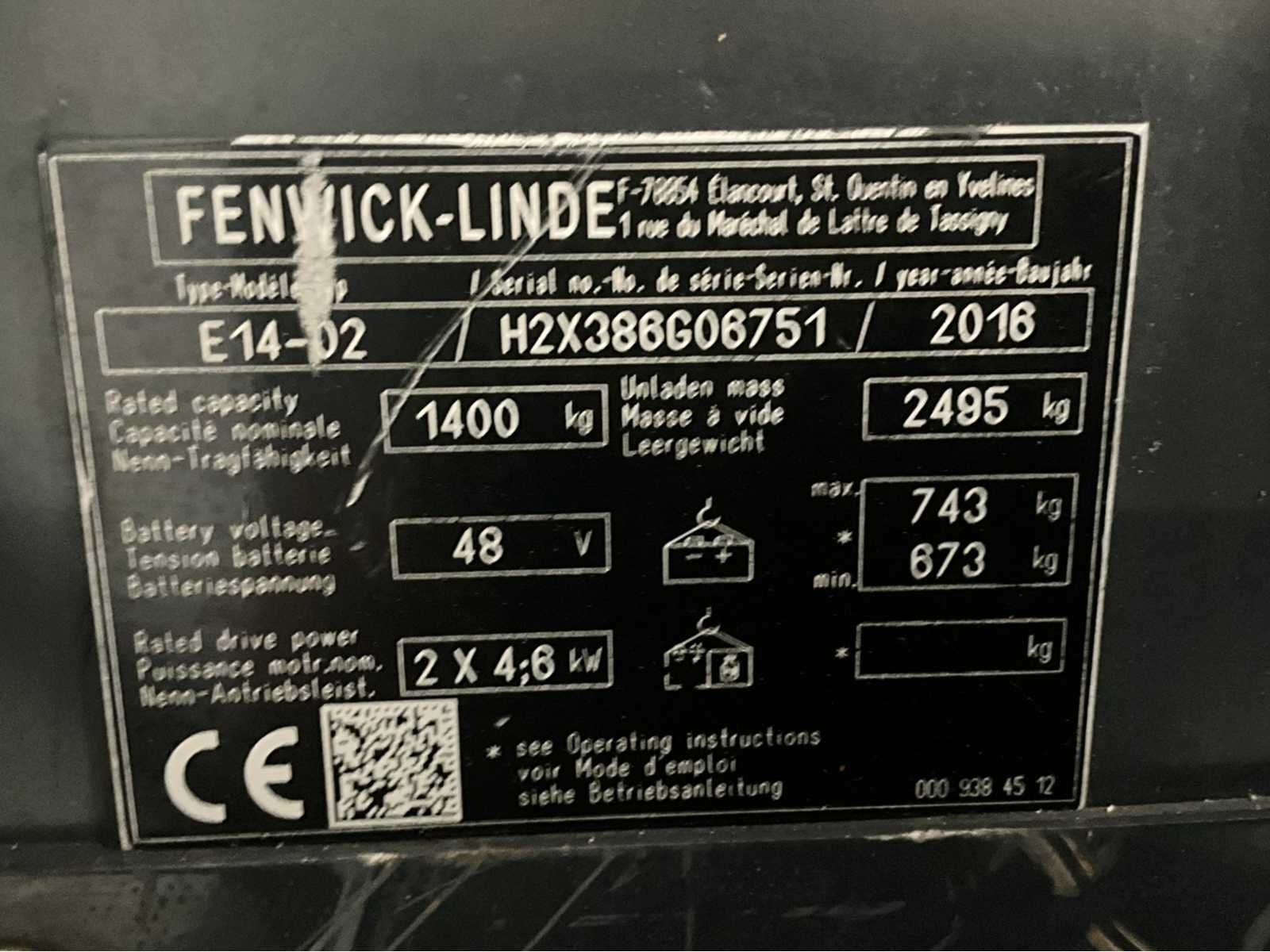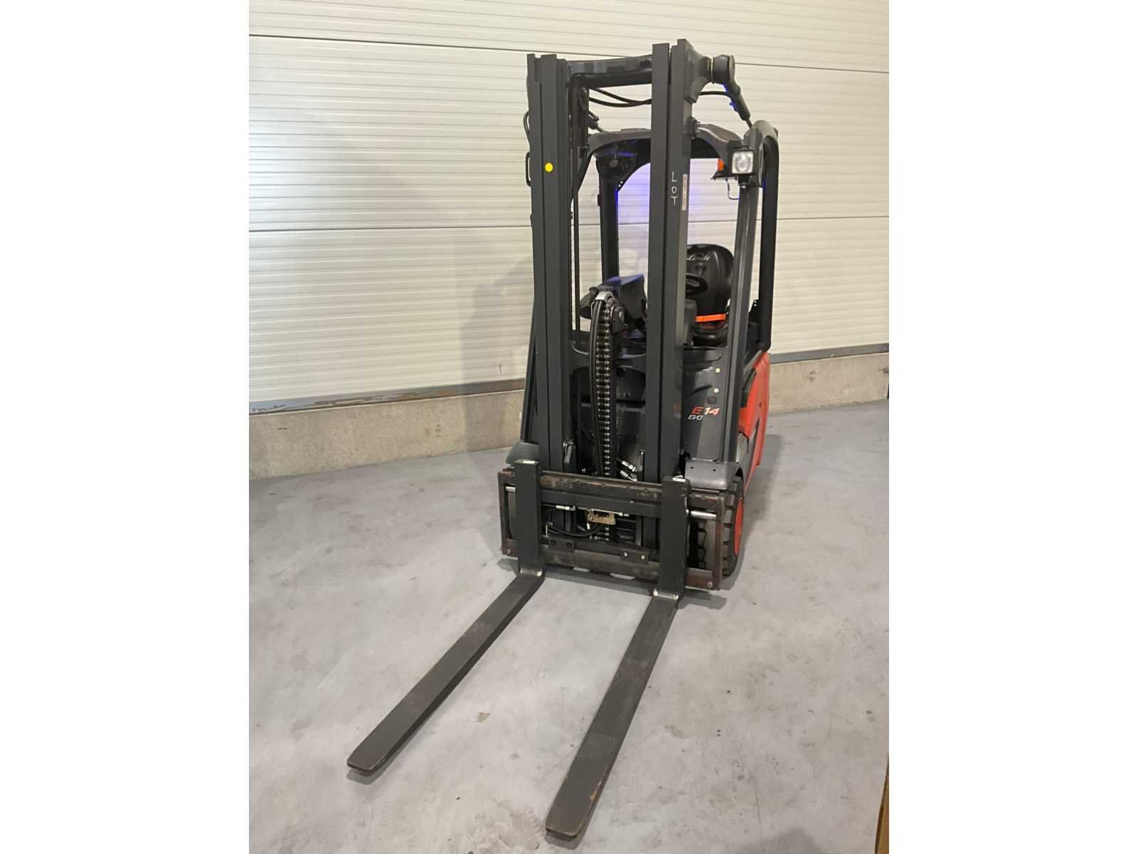 Extra opties : Blue spot , Elektrische handrem , Zwaailamp , Joystick , Verlichting voor Nee Merk: Linde Type: E14-02 Bouwjaar: 2016 Serienummer: H2X386G06751 Mast: Triple Soort band: Volrubber banden Aantal wielen: 3 Afgelezen urenstand: 7126 Free-lift: true Side-shift: true Triple mast: true Eigen gewicht: 3238kg Hefvermogen: 1400kg Hefhoogte: 4620mm Vol rubber banden: true Totale afmeting L: 3080mm Totale afmeting Breedte: 1030mm Totale afmeting Hoogte: 2140mm