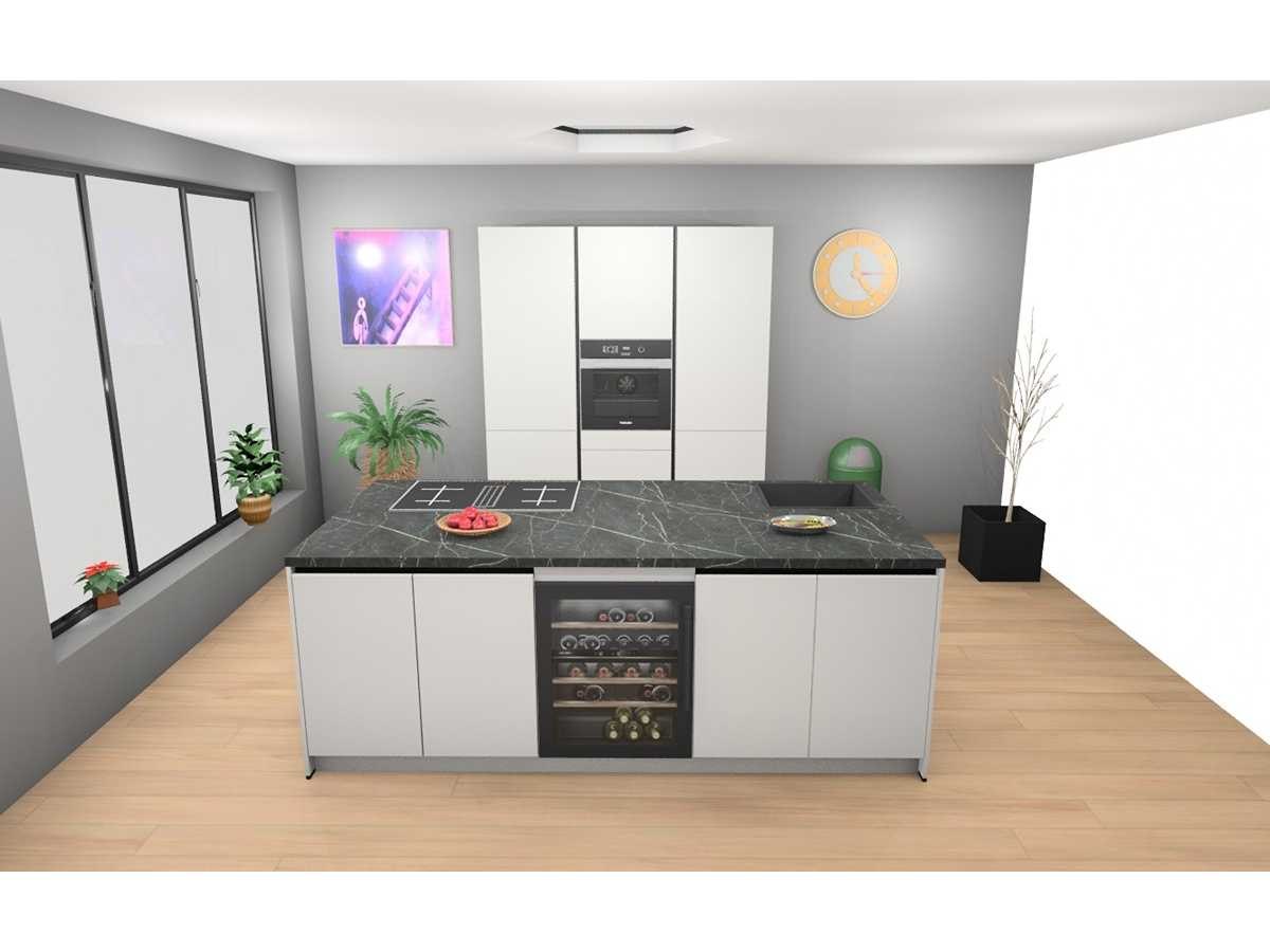 Miele KMDA7473FR-U Inductiekookplaat inclusief afzuigsysteem, 4 kookzones, 2 flex zones, 80cm. Siemens KU21WAHG0 Onderbouw wijnklimaatkast 60x82cm. Let op! Staat niet opgesteld in de showroom, enkel via 3D tekening; wordt geleverd ongebruikt in doos. Let op! Excl. Kraan en accessoires. Nee Merk: Häcker Concept130 Model: Topsoft mat wit lak Type keukenopstelling: Eiland Lengte: 185cm Breedte: 60cm Hoogte: 218cm Gootsteen: Reginox Amsterdam 50 pure black Pure Black opbouw spoelbak 50x40cm Werkblad hoogte: 92cm Aanrechtblad: HPL Kunststof marmer groen repro (150) Koelkast: Miele K7125E Integreerbare koelkast met superKoelen, inhoud 136 liter, Nis 88cm Softclose: true Oven: Miele H2861BCLST Multifunctionele oven PureLine met 8 programma's, inhoud 76 liter, Nis 60cm. Vaatwasser: Miele G5150SCVI Volledig integreerbare vaatwasmachine met 5 reinigingsprogramma's 60cm Lengte kookeiland: 244cm Breedte kookeiland: 120cm Hoogte kookeiland: 92cm Plintkleur: mat wit Hoofdkleur: mat wit lak Style: Modern greeploos Kleur: mat wit lak