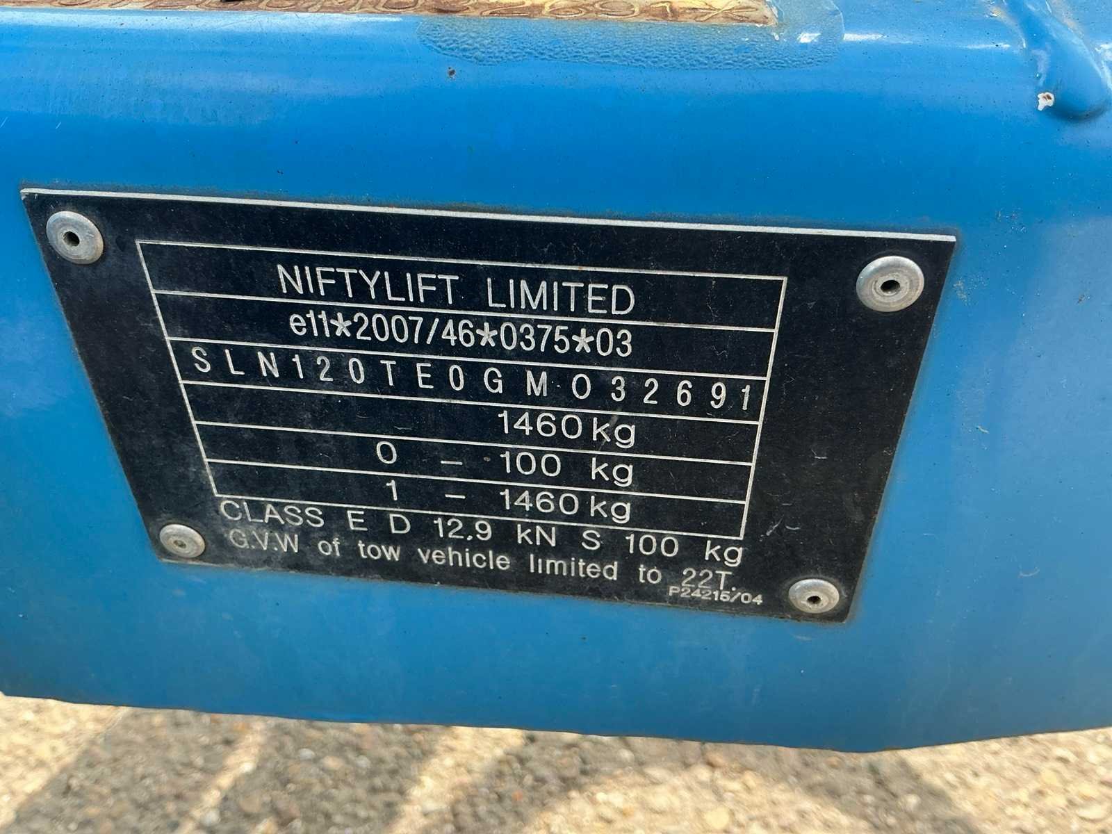 Knikarm telescoop aanhangwagen hoogwerker; enkel assige aanhangwagen; 230 Volt elektrische bediening; kooibediening; 4x hydraulische neerklapbare stempelvoet; afstempelvlak 2700x2700 mm; oplooprem; neuswiel; urenstand niet afleesbaar; Breedte verstelbare as. No Merk: Niftylift Type: 120TE MK1C Bouwjaar: 2016 Serienummer: 04 32691 Diesel: true Elektrisch: true Knikarm hoogwerker: true Werkhoogte: 12330mm Horizontale rijkwijdte: 5000mm Plateau afm. l: 600mm Plateau afm. b: 900mm Platform capaciteit: 200kg Totale afmeting L: 4500mm Totale afmeting Breedte: 1400mm Totale afmeting Hoogte: 1900mm