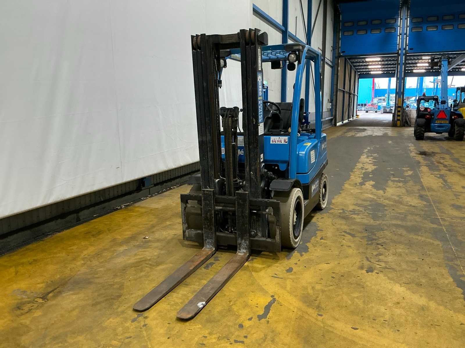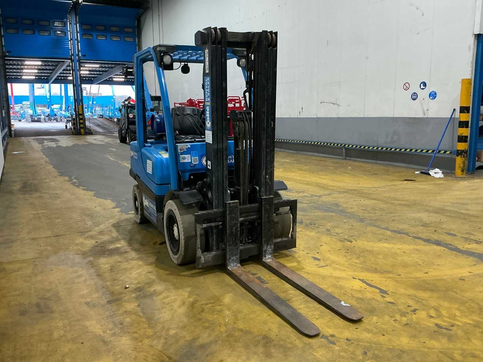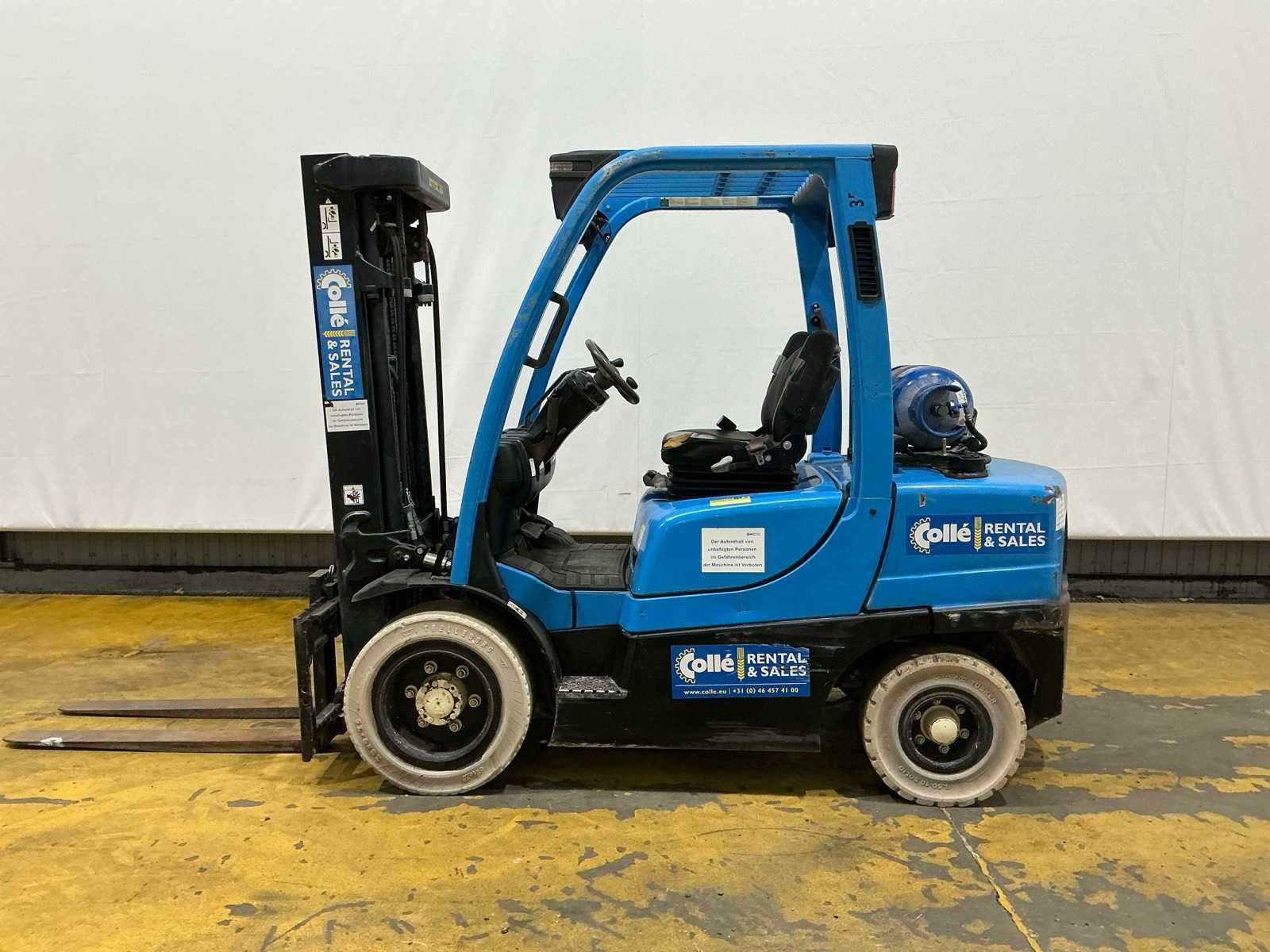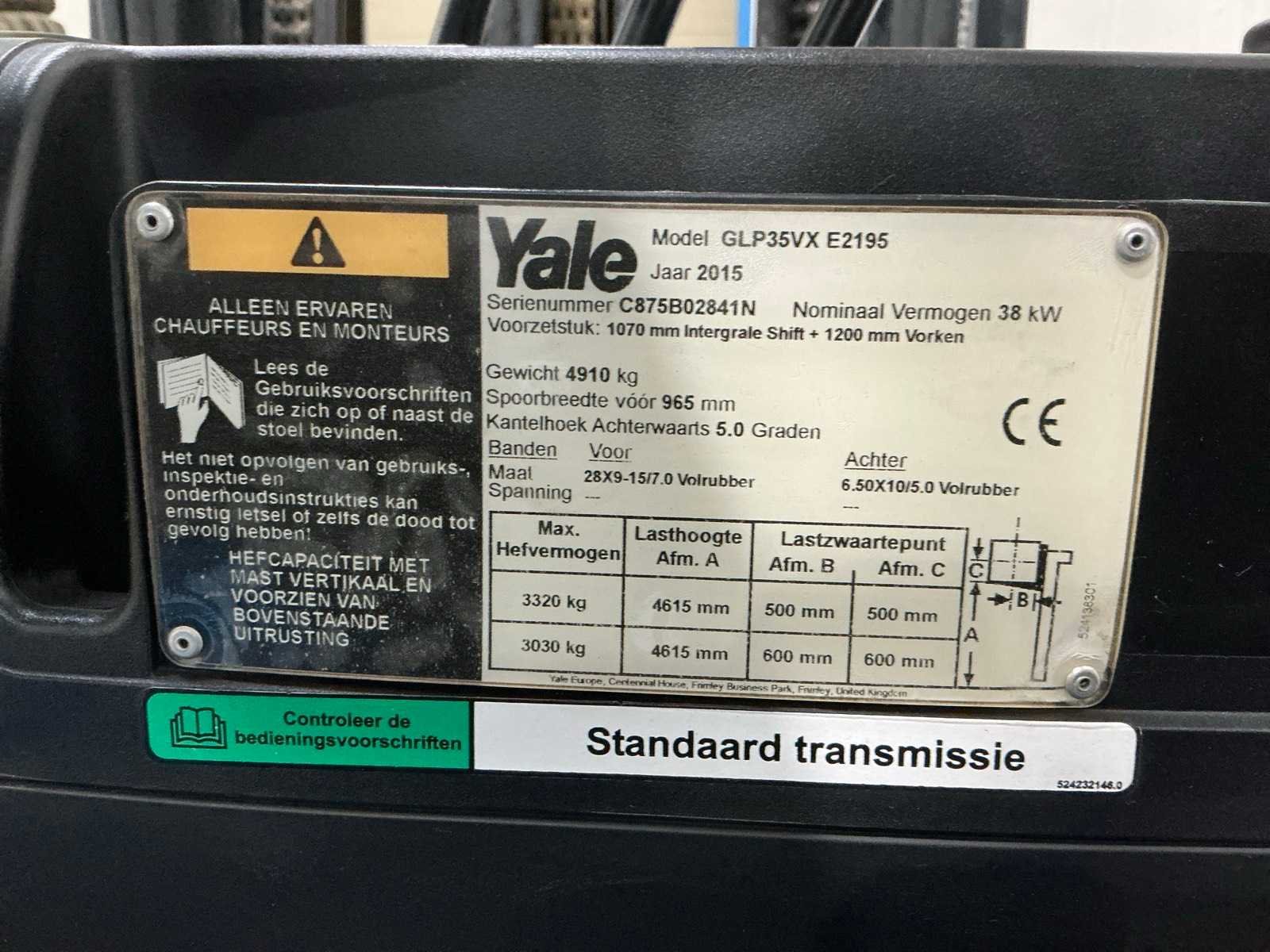 Zonder gasfles; non marking banden; working condition No Merk: Yale Type: GLP35VX E2195 Bouwjaar: 2015 Serienummer: C875B02841N Brandstof: LPG Mast: Triple Soort band: Volrubber banden Aantal wielen: 4 Side-shift: true Triple mast: true Eigen gewicht: 4910kg Hefvermogen: 3500kg Lepellengte: 1190mm Minimale doorrijhoogte: 2200mm Totale afmeting L: 4000mm Totale afmeting Breedte: 1200mm Totale afmeting Hoogte: 2200mm LPG: true