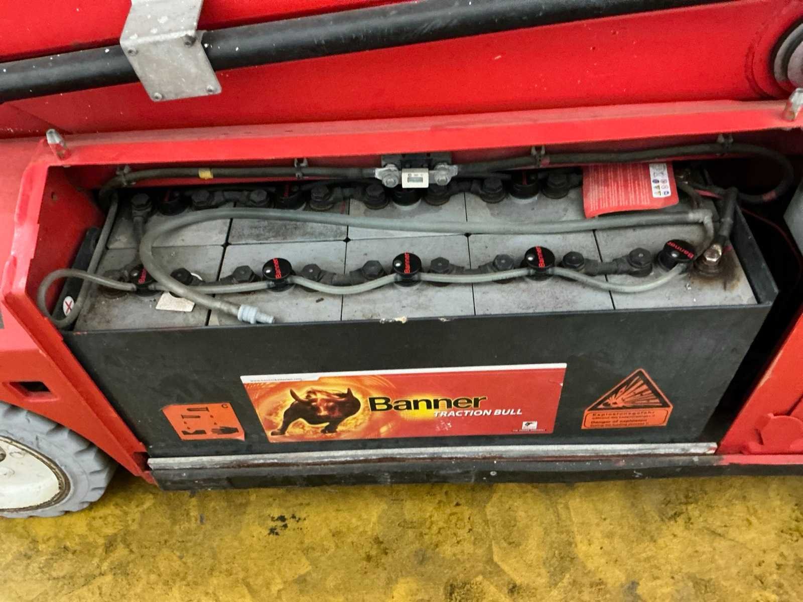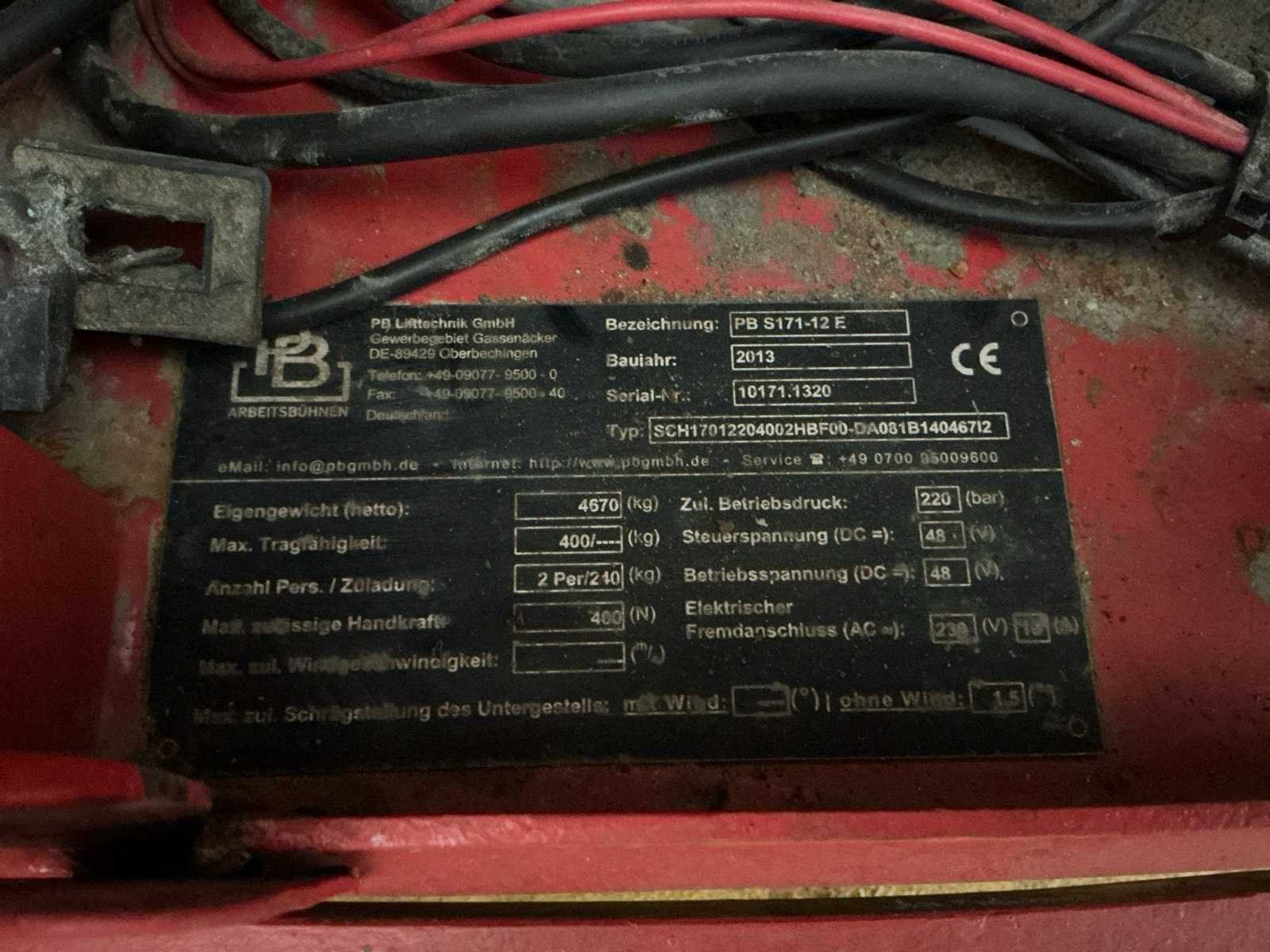 Transporthoogte 2350 mm; urenstand niet afleesbaar; accupakket dient vervangen te worden. No Merk: PB Type: S171-12E Bouwjaar: 2013 Serienummer: 10171.1320 Schaarhoogwerker: true Werkhoogte: 17000mm Horizontale rijkwijdte: 15000mm Plateau afm. l: 3000mm Plateau afm. b: 1000mm Platform capaciteit: 400kg Accu lader: true Eigen gewicht: 4670kg Totale afmeting L: 3100mm Totale afmeting Breedte: 1200mm Totale afmeting Hoogte: 2350mm