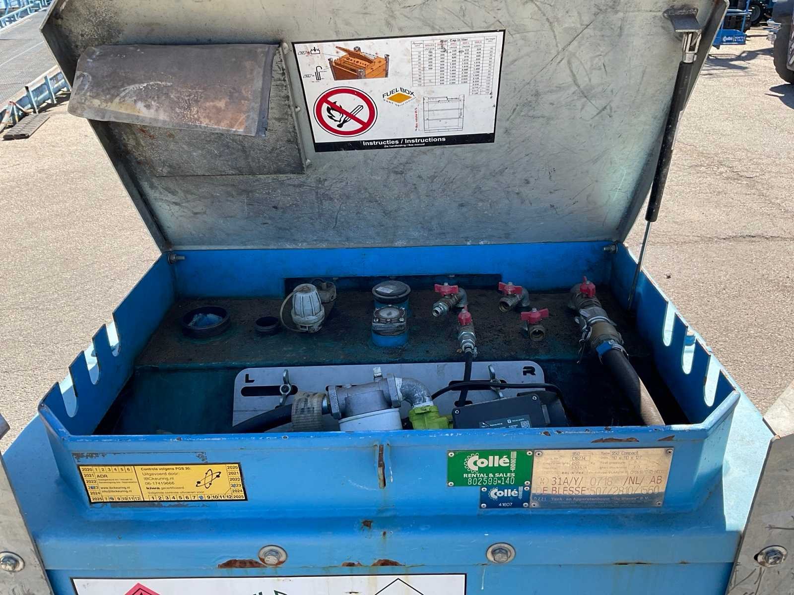 Inclusief elektrische pomp, heftruck sleuven en hijsogen. Nee Merk: De Blesse Type: 950 Compact Staal: true Capaciteit.: 950l Mangat: true Dubbelwandig: true Eigen gewicht: 480kg Totale afmeting L: 1100mm Totale afmeting Breedte: 1100mm Totale afmeting Hoogte: 1270mm