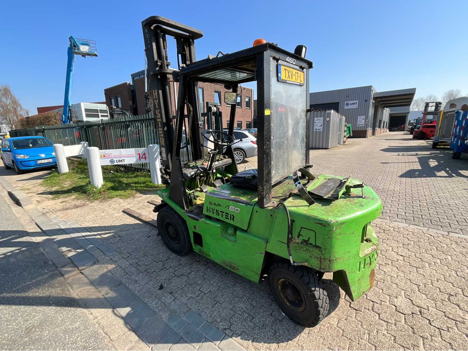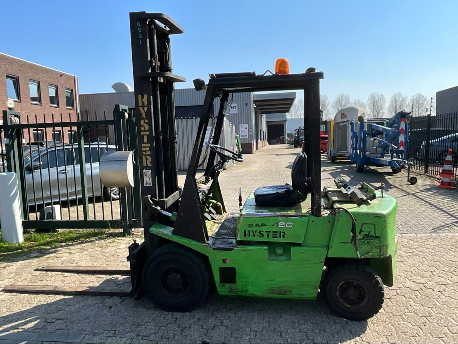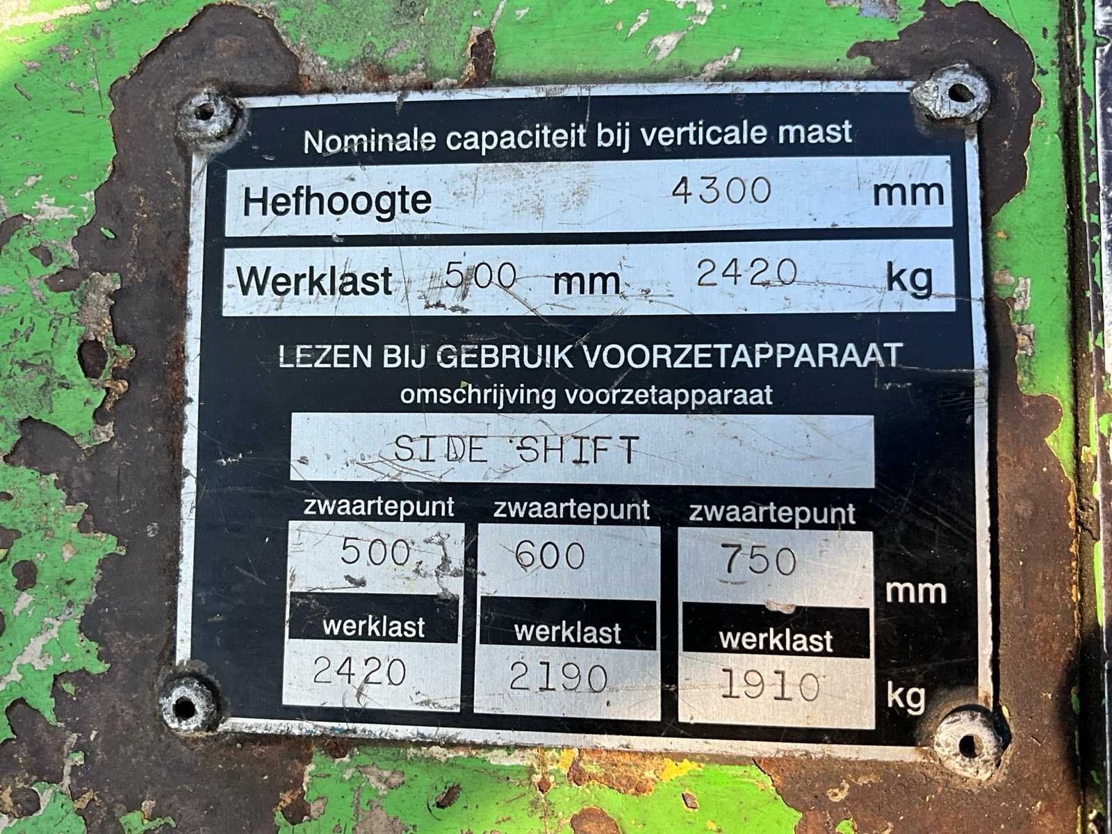 Voor luchtbanden achter vol rubber, met kenteken, met keuring Nee Merk: Hyster Serienummer: A177B11457B Brandstof: LPG Kenteken: Txv Mast: Duplex Aantal wielen: 4 Side-shift: true Duplex mast: true Hefvermogen: 2500kg Lepellengte: 1500mm Max. hefhoogte: 4300mm Hefhoogte: 4300mm Minimale doorrijhoogte: 2750mm Totale afmeting L: 4200mm Totale afmeting Breedte: 1150mm Totale afmeting Hoogte: 2750mm LPG: true